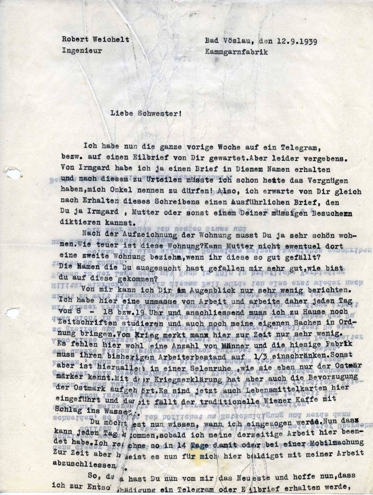 Von mir kann ich Dir im Augenblick nur sehr wenig berichten. Ich habe hier eine Unmasse von Arbeit und arbeite daher jeden Tag von 8 – 18 bzw. 19 Uhr und anschließend muss ich zu Hause noch Zeitschriften studieren und auch noch meine eigenen Sachen in Ordnung bringen. Vom Krieg merkt man hier zur Zeit nur sehr wenig. Es fehlen hier wohl eine Anzahl von Männer und die diesige Fabrik muss ihren bisherigen Arbeiterbestand auf 1/3 einschränken. Sonst aber ist hier alles in einer Seelenruhe, wie sie eben nur der Ostmärker kennt. Mit der Kriegserklärung hat aber auch die Bevorzugung der Ostmark aufgehört. Es sind jetzt auch Lebensmittelkarten hier eingeführt und damit fällt der traditionelle Wiener Kaffee mit Schlag ins Wasser.