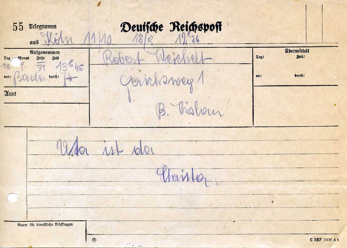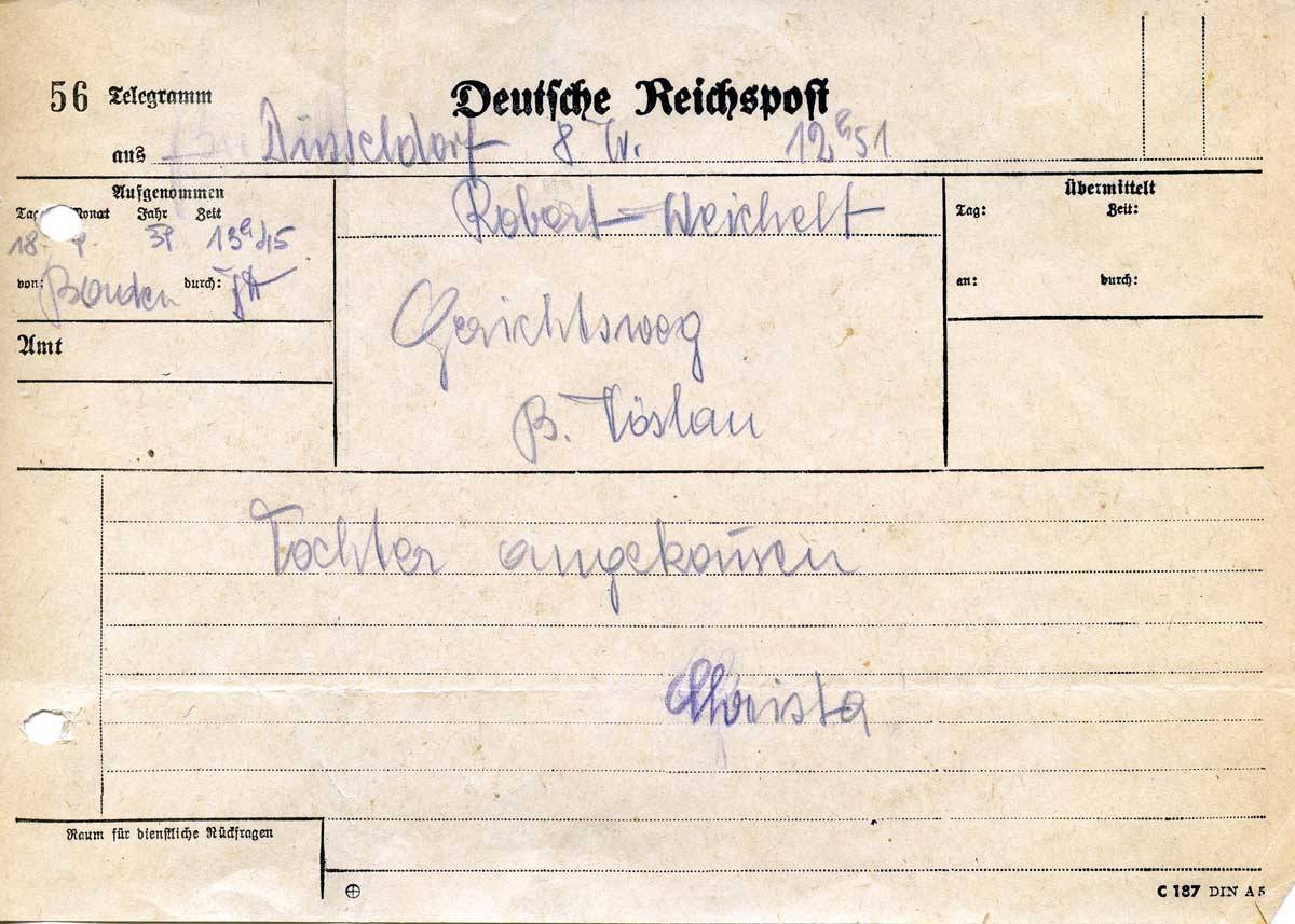 Christa Lehmacher an ihren Bruder Robert Weichelt, 18. September 1939 Uta ist da Christa Tochter angekommen Christa