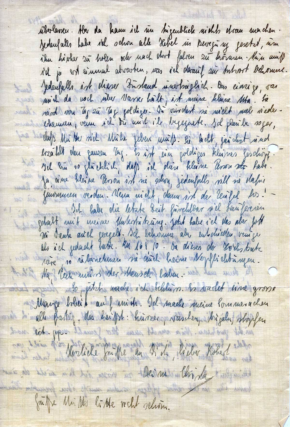 Günther ist ja nun auch in den Krieg gezogen. Weißt Du, dieses Alleinsein ist schauderhaft. Ich kann mich daran nicht gewöhnen. Nun macht mein Herr Gemahl mir auch noch solche Sorgen mit einem Magengeschwür. Ich weiß nicht, was das noch geben soll! Ein Magengeschwür ist ja letzten Endes keine Kleinigkeit. Es ist nicht leicht zu wissen, ich bin nicht da und kann ihn nicht selber pflegen, sondern muss ihn fremden Händen