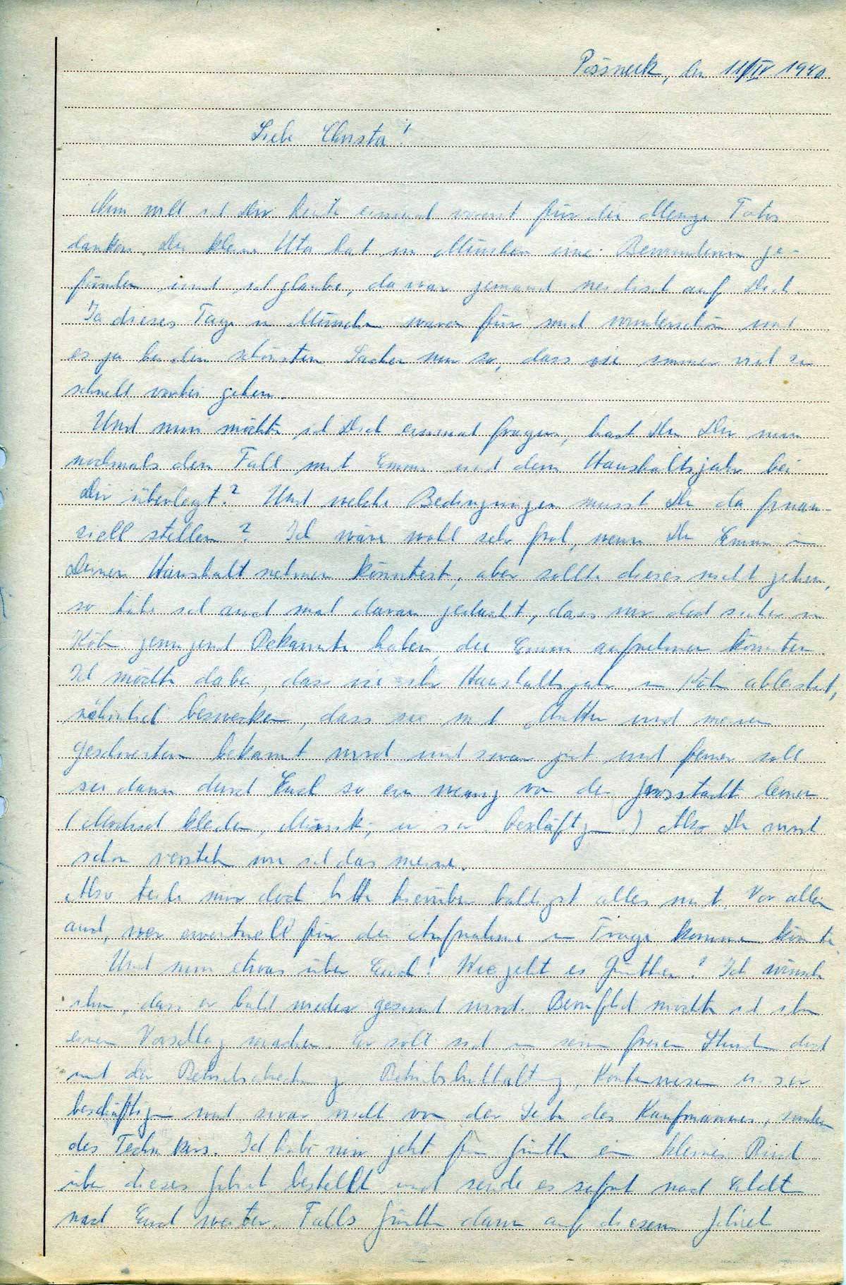Und nun möchte ich Dich einmal fragen, hast Du Dir nun nochmals den Fall mit Emma und dem Haushaltsjahr bei Dir überlegt? Und welche Bedingungen musst Du da finanziell stellen? Ich wäre wohl sehr froh, wen Du Emma in Deinen Haushalt nehmen könntest; aber sollte dieses nicht gehen, so habe ich auch mal daran gedacht, dass wir doch sicher in Köln genügend Bekannte haben, die Emma aufnehmen könnten. Ich möchte dabei, dass sie ihr Haushaltsjahr in Köln ableistet, nähmlich bemerken, dass sie mit Mutter und meinen Geschwistern bekannt wird und zwar gut und ferner soll sie dann durch Euch so wein wenig von der Grosstadt lernen (Modisch kleiden, Musik, u. so beschäftigen) Also Du wirst schon verstehn wie ich das meine.