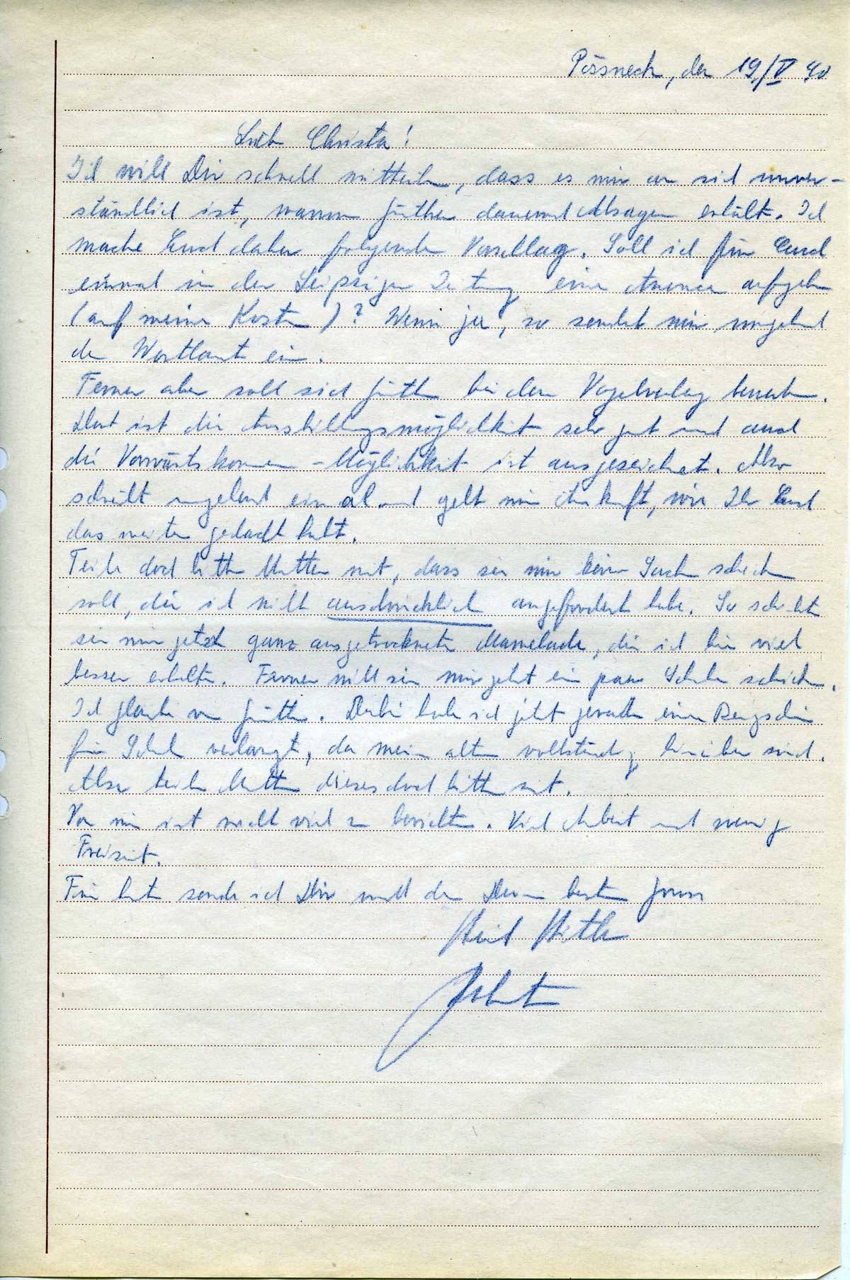 Teile doch bitte Mutter mit, dass sie mir keine Sachen schicken soll, die ich nicht ausdrücklich angefordert habe. So schickt sie mir jetzt ganz ausgetrocknete Marmelade, die ich hier viel besser erhalte. Ferner will sie mir jetzt ein paar Schuhe schicken. Ich glaube von Günther. Dabei habe ich jetzt gerade einen Bezugsschein für Schuhe verlangt, da meine alten vollständig hinüber sind. Also teile Mutter dies doch bitte mit.