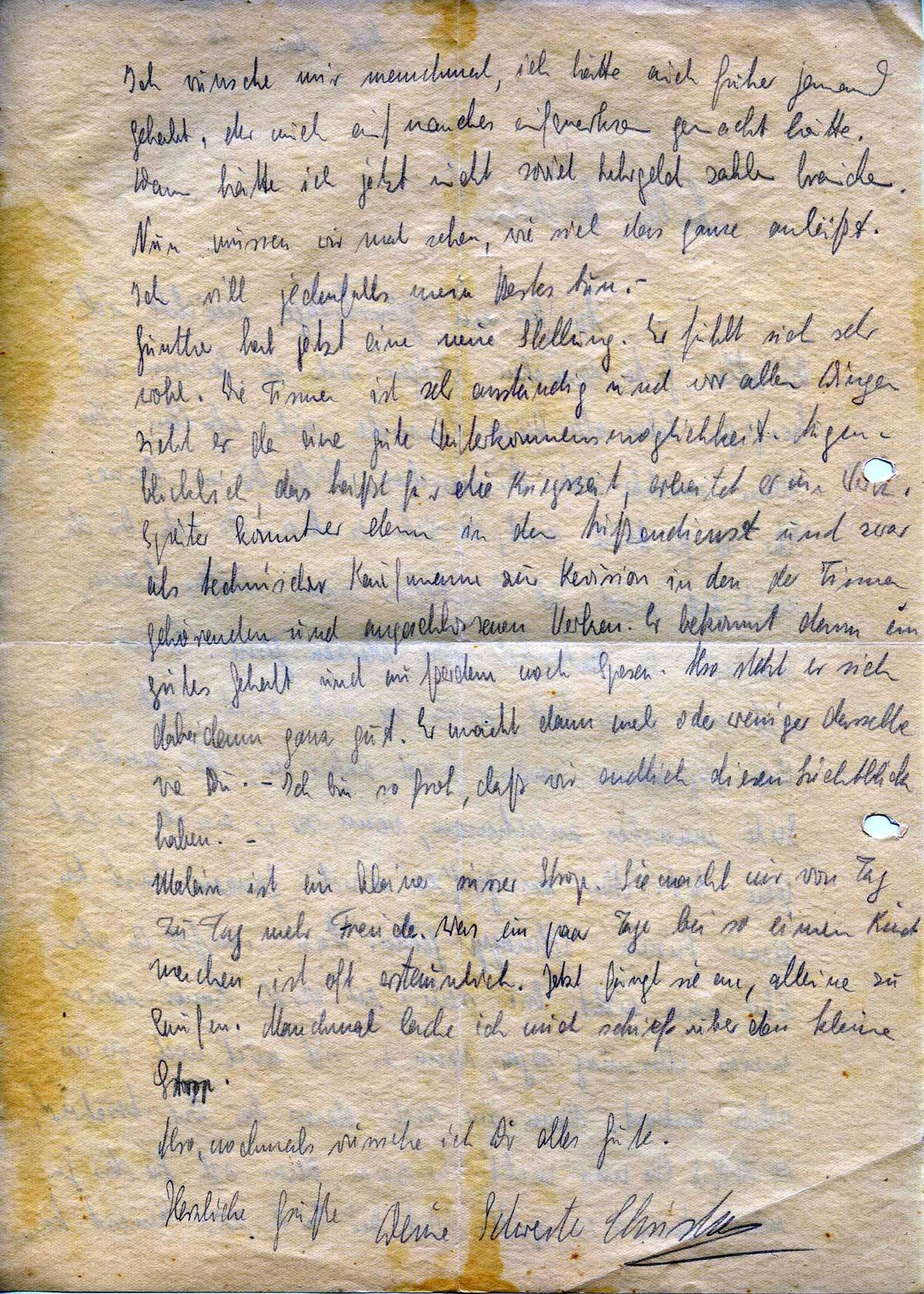 Günther hat jetzt eine neue Stellung. Er fühlt sich sehr wohl. Die Firma ist sehr anständig und vor allen Dingen sieht er da eine gute Weiterkommensmöglichkeit. Augenblicklich, das heißt für die Kriegszeit, arbeitet er im Werk. Später kommt er dann in den Außendienst und zwar als technischer Kaufmann zur Revision in den der Firma gehörenden und angeschlossenen Werken. Er bekommt dann ein gutes Gehalt und außerdem noch Spesen. Also steht er sich dabei dann ganz gut. Er macht dann mehr oder weniger dasselbe wie Du. – Ich bin so froh, daß wir endlich diesen Lichtblick haben. –