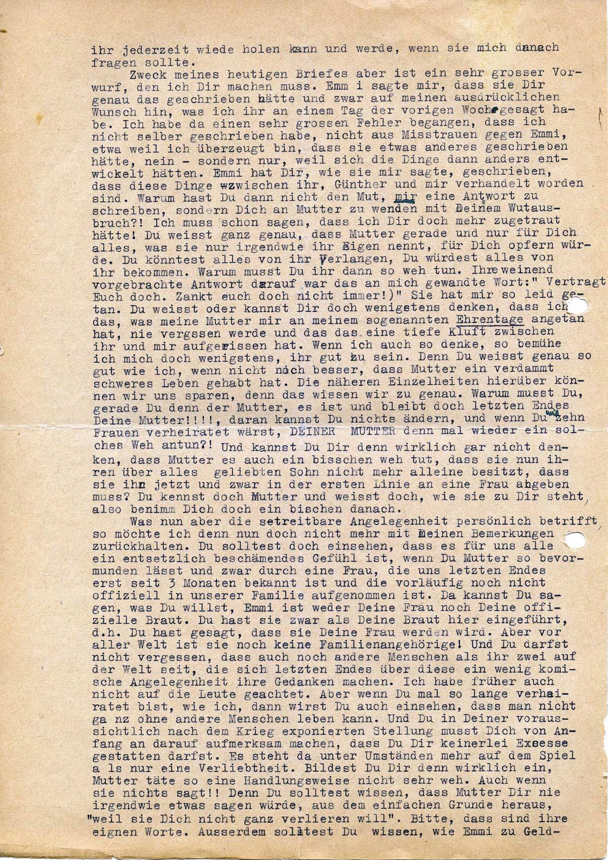 Zweck meines heutigen Briefes aber ist ein sehr großer Vorwurf, den ich Dir machen muss. Emmi sagte mir, dass sie Dir genau das geschrieben hätte und zwar auf meinen ausdrücklichen Wunsch hin, was ich ihr an einem Tag der vorigen Woche gesagt habe. Ich habe da einen sehr großen Fehler begangen, dass ich nicht selber geschrieben habe, nicht aus Misstrauen gegen Emmi, etwa weil ich überzeugt bin, dass sie etwas anderes geschrieben hätte, nein – sondern nur, weil sich die Dinge dann anders entwickelt hätten. Emmi hat Dir, wie sie mir sagte, geschrieben, dass diese Dinge zwischen ihr, Günther und mir verhandelt worden sind. Warum hast Du dann nicht den Mut, mir eine Antwort zu schreiben, sondern Dich an Mutter zu wenden mit Deinem Wutausbruch?! Du Weißt genau, dass Mutter gerade und nur für Dich alles, was sie nur irgendwie ihr eigen nennt, für Dich opfern würde. Du könntest alles von ihr Verlangen, Du würdest alles von ihr bekommen. Warum musst Du ihr dann so weh tun. Ihre weinend vorgebrachte Antwort darauf war das an mich gewandte Wort: „Vertragt Euch doch. Zankt euch doch nicht immer!“ Sie hat mir so leid getan. Du weißt oder kannst Dir doch wenigstens denken, dass ich das, was meine Mutter mir an meinem sogenannten Ehrentage angetan hat, nie vergessen werde und dass das eine tiefe Kluft zwischen ihr und mir aufgerissen hat. Wenn ich auch so denke, so bemühe ich mich doch wenigstens, ihr gut zu sein. Denn Du weißt genau so gut wie ich, wenn nicht noch besser, dass Mutter ein verdammt schweres Leben gehabt hat. Die näheren Einzelheiten hierüber können wir uns sparen, denn das wissen wir zu genau. Warum musst Du, gerade Du denn der Mutter, es ist und bleibt doch letzten Endes Deine Mutter ! ! ! !, daran kannst Du nichts ändern, und wenn Du mit zehn Frauen verheiratet wärst, DEINER MUTTER denn mal wieder ein solches Weh antun?! Und kannst Du Dir denn wirklich gar nicht denken, dass Mutter es auch ein bisschen weh tut, dass sie nun ihren über alles geliebten Sohn nicht mehr alleine besitzt, dass sie ihn jetzt und zwar in der ersten Linie an eine Frau abgeben muss? Du kennst doch Mutter und weißt doch, wie sie zu Dir steht, also benimm Dich doch ein bisschen danach.