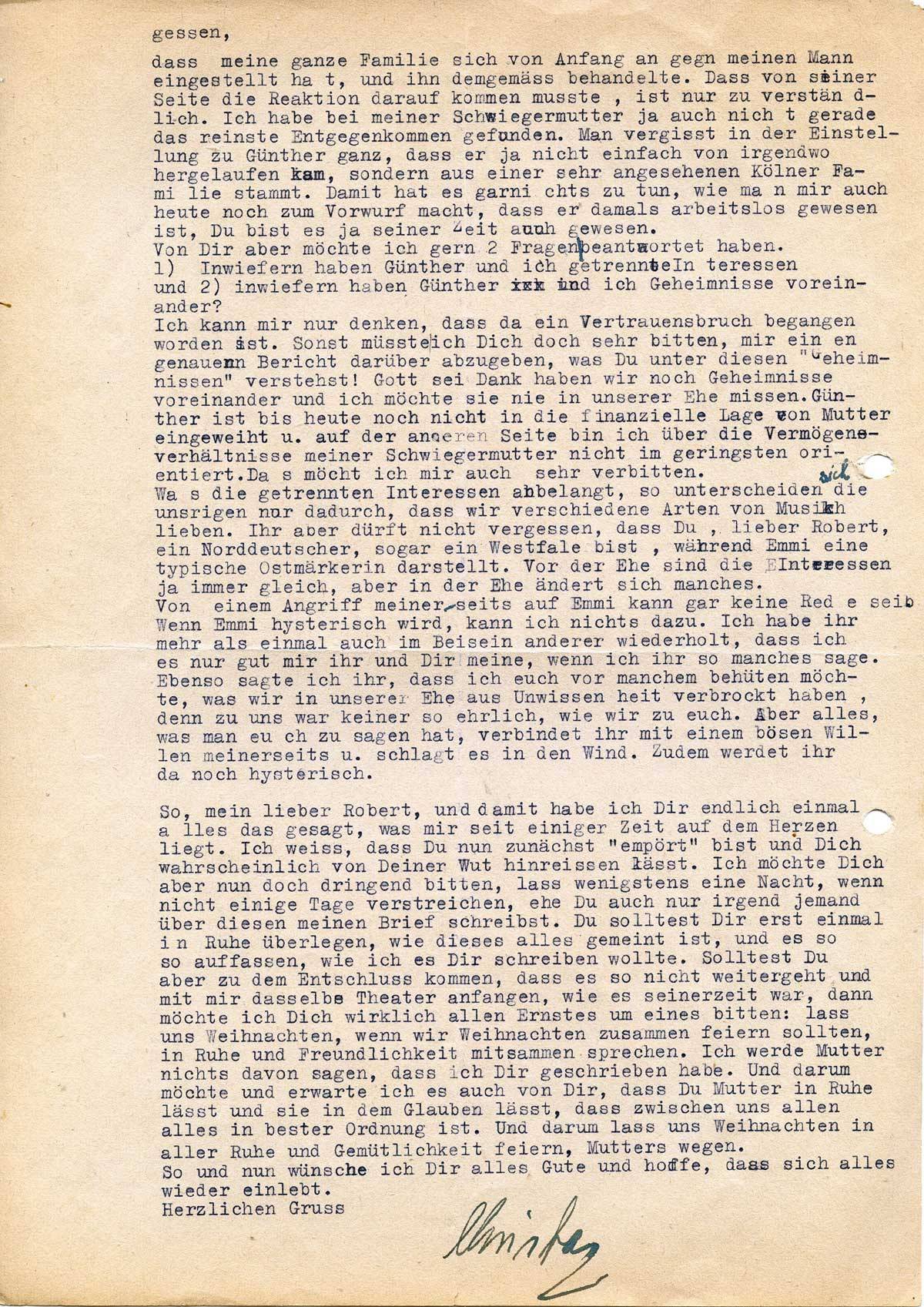 So, mein lieber Robert, und damit habe ich Dir endlich einmal alles das gesagt, was mir seit einiger Zeit auf dem Herzen liegt. Ich weiß, dass Du nun zunächst „empört“ bist und Dich wahrscheinlich von Deiner Wut hinreißen lässt. Ich möchte Dich aber nun doch dringend bitten, lass wenigstens eine Nacht, wenn nicht einige Tage verstreichen, ehe Du auch nur irgend jemand über diesen meinen Brief schreibst. Du solltest Dir erst einmal in Ruhe überlegen, wie dieses alles gemeint ist, und es so auffassen, wie ich es Dir schreiben wollte. Solltest Du aber zu dem Entschluss kommen, dass es so nicht weitergeht und mit mir dasselbe Theater anfangen, wie es seinerzeit war, dann möchte ich Dich wirklich allen Ernstes um eines bitten: lass uns Weihnachten, wenn wir Weihnachten zusammen feiern sollten, in Ruhe und Freundlichkeit mitsammen sprechen. Ich werde Mutter nichts davon sagen, dass ich Dir geschrieben habe. Und darum möchte und erwarte ich es auch von Dir, dass Du Mutter in Ruhe lässt und sie in dem Glauben lässt, dass zwischen uns allen alles in bester Ordnung ist. Und darum lass uns Weihnachten in aller Ruhe und Gemütlichkeit feiern, Mutters wegen.