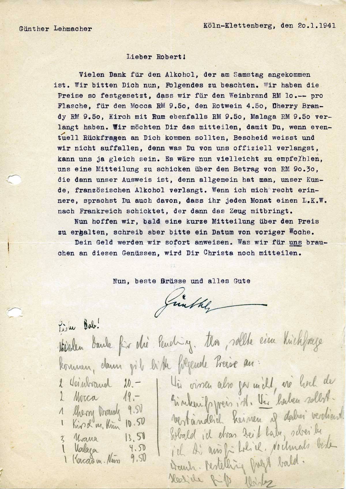 Vielen Dank für den Alkohol, der am Samstag angekommen ist. Wir bitten Dich nun, Folgendes zu beachten. Wir haben die Preise so festgesetzt, dass wir für den Weinbrand RM 10,-- pro Flasche, für den Mocca RM 9,50, den Rotwein 4,50, Cherry Brandy RM 9,50, Kirsch mit Rum ebenfalls RM 9,50, Malaga RM 9,50 verlangt haben. Wir möchten Dir das mitteilen, damit Du, wenn eventuell Rückfragen an Dich kommen sollten, Bescheid weißt und wir nicht auffallen, denn was Du von uns offiziell verlangst, kann uns ja gleich sein. Es wäre nun vielleicht zu empfehlen, uns eine Mitteilung zu schicken über den Betrag von RM 90,30, die dann unser Ausweis ist, denn allgemein hat man, unser Kunde, französischen Alkohol verlangt. Wenn ich mich recht erinnere, sprachst Du auch davon, dass ihr jeden Monat einen L.K.W. nach Frankreich schicktet, der dann das Zeug mitbringt.