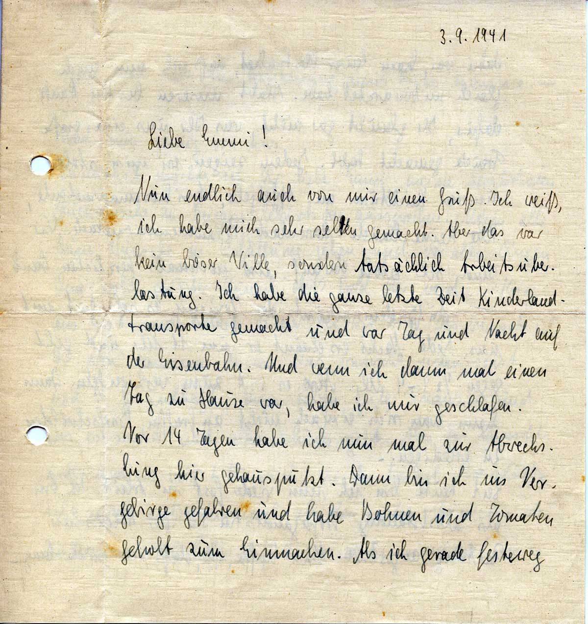 Nun endlich auch von mir einen Gruß. Ich weiß, ich habe mich sehr selten gemacht. Aber das war kein böser Wille, sondern tatsächlich Arbeitsüberlastung. Ich habe die ganze letzte Zeit Kinderlandtransporte gemacht und war Tag und Nacht auf der Eisenbahn. Und wenn ich dann mal einen Tag zu Hause war, habe ich nur geschlafen.