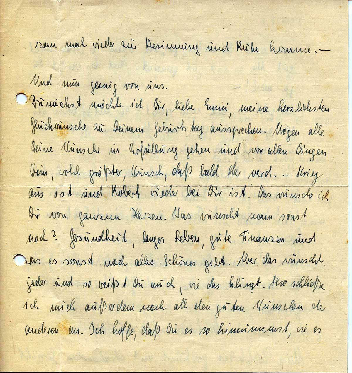 Zunächst möchte ich Dir, liebe Emmi, meine herzlichsten Glückwünsche zu Deinem Geburtstag aussprechen. Mögen alle Deine Wünsche in Erfüllung gehen und vor allen Dingen Dein, wohl größter, Wunsch, daß bald der verd.... Krieg aus ist und Robert wieder bei Dir ist. Das wünsche ich Dir von ganzem Herzen. Was wünscht man sonst noch? Gesundheit, langes Leben, gute Finanzen und was es sonst noch alles Schönes gibt. Aber das wünscht jeder und so weißt Du auch, wie das klingt. Also schließe ich mich außerdem noch all den guten Wünschen der anderen an. Ich hoffe, daß Du es so hinnimmst, wie es