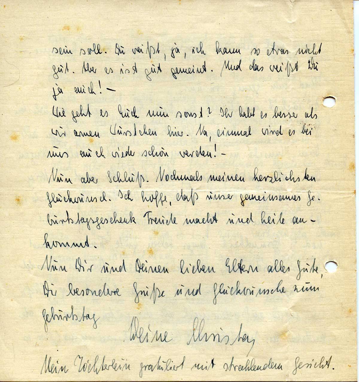 Nun aber Schluß. Nochmals meinen herzlichsten Glückwunsch. Ich hoffe, daß unser gemeinsames Geburtstagsgeschenk Freude macht und heile ankommt.