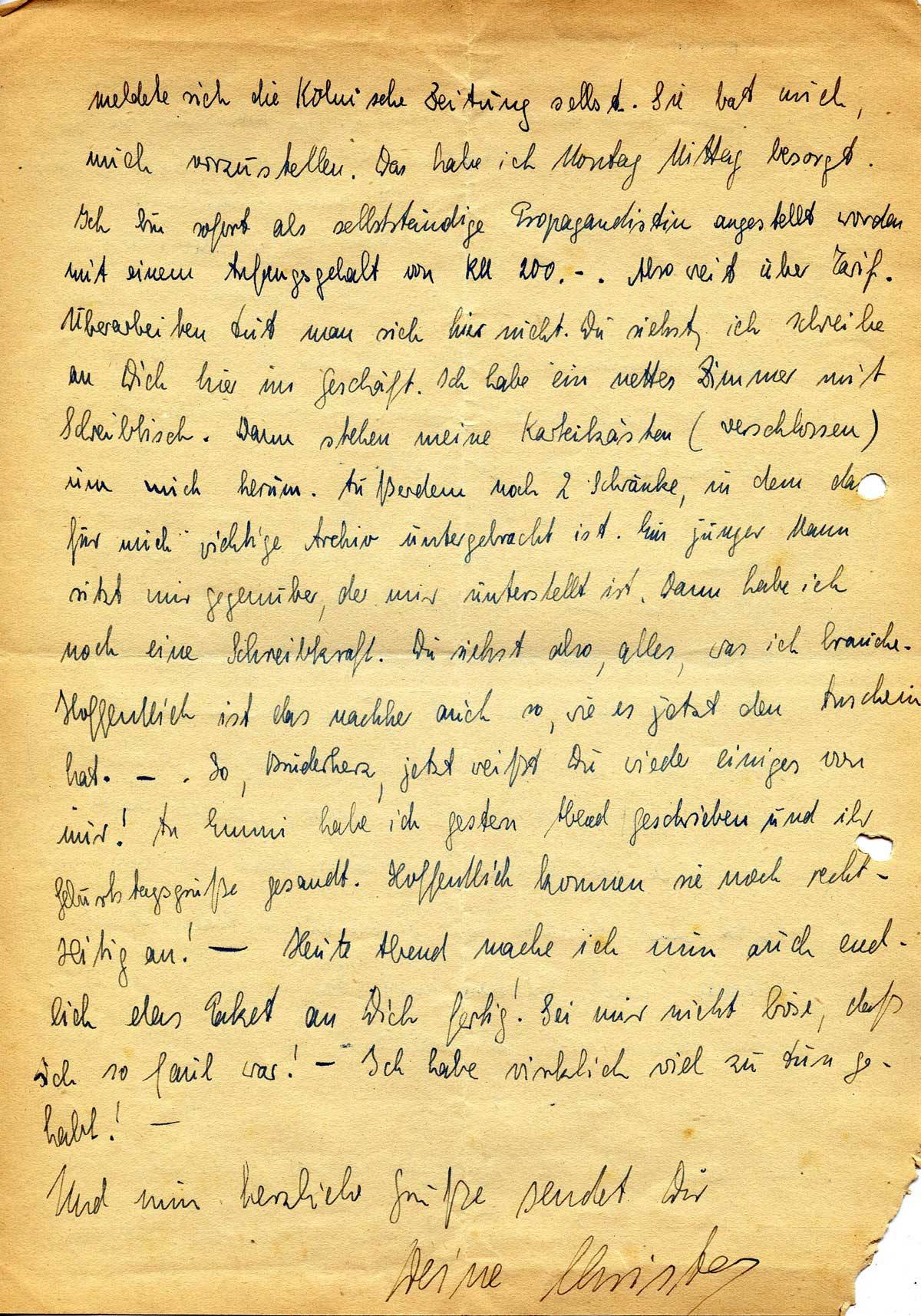 Ich bin sofort als selbstständige Propagandistin angestellt worden mit einem Anfangsgehalt von RM 200,-. Also weit über Tarif. Überarbeiten tut man sich hier nicht. Du siehst, ich schreibe an Dich hier im Geschäft. Ich habe ein nettes Zimmer mit Schreibtisch. Dann stehen meine Karteikästen (verschlossen) um mich herum. Außerdem noch 2 Schränke, in dem das für mich richtige Archiv untergebracht ist. Ein junger Mann sitzt mir gegenüber, der mir unterstellt ist. Dann habe ich noch eine Schreibkraft. Du siehst also, alles, was ich brauche. Hoffentlich ist das nachher auch so, wie es jetzt den Anschein hat. – So, Bruderherz, jetzt weißt Du wieder einiges von mir! An Emmi habe ich gestern Abend geschrieben und ihr Geburtstagsgrüße gesandt. Hoffentlich kommen sie noch rechtzeitig an! – Heute Abend mache ich nun auch endlich das Paket an Dich fertig! Sei mir nicht böse, daß ich so faul war! – Ich habe wirklich viel zu tun gehabt! –