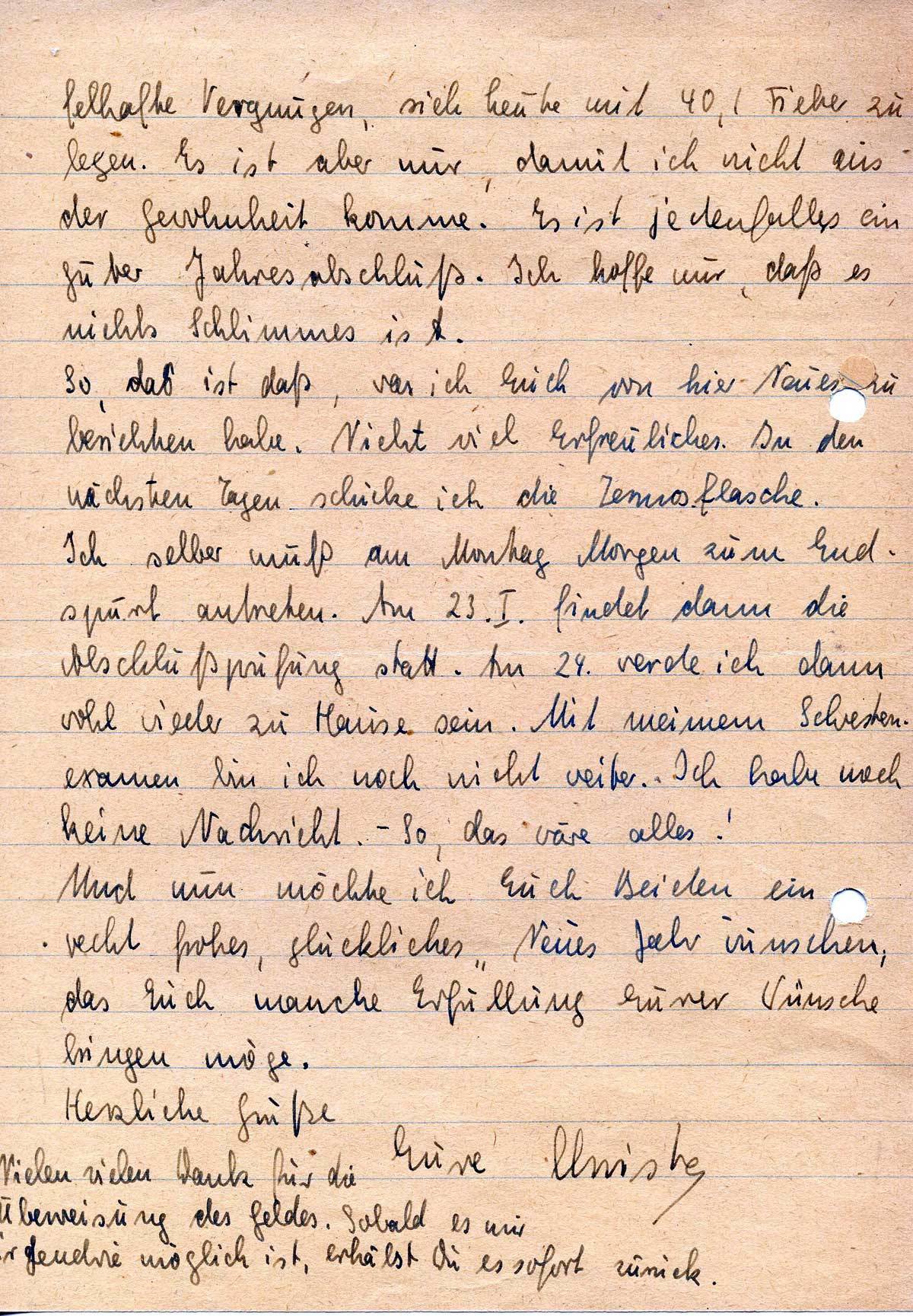 Ich selber muß am Montag Morgen zum Endspurt antreten. Am 23.I. findet dann die Abschlußprüfung statt. Am 24. werde ich dann wohl wieder zu Hause sein. Mit meinem Schwesternexamen bin ich noch nicht weiter. Ich habe noch keine Nachricht. – So, das wäre alles!