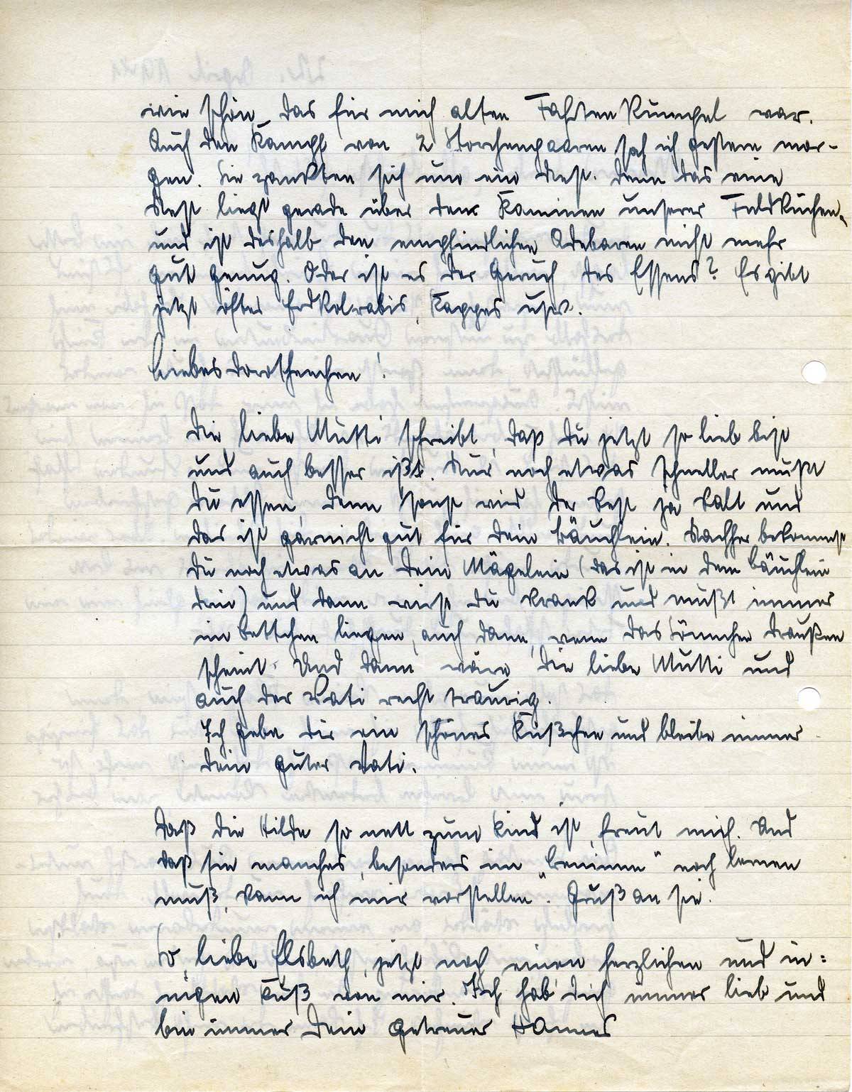 Daß die Hilde [das neue Pflichtjahr-Mädchen] so nett zum Kind ist, freut mich. Und daß sie manches, besonders im „Benimm“ noch lernen muß, kann ich mir vorstellen. Gruß an sie.