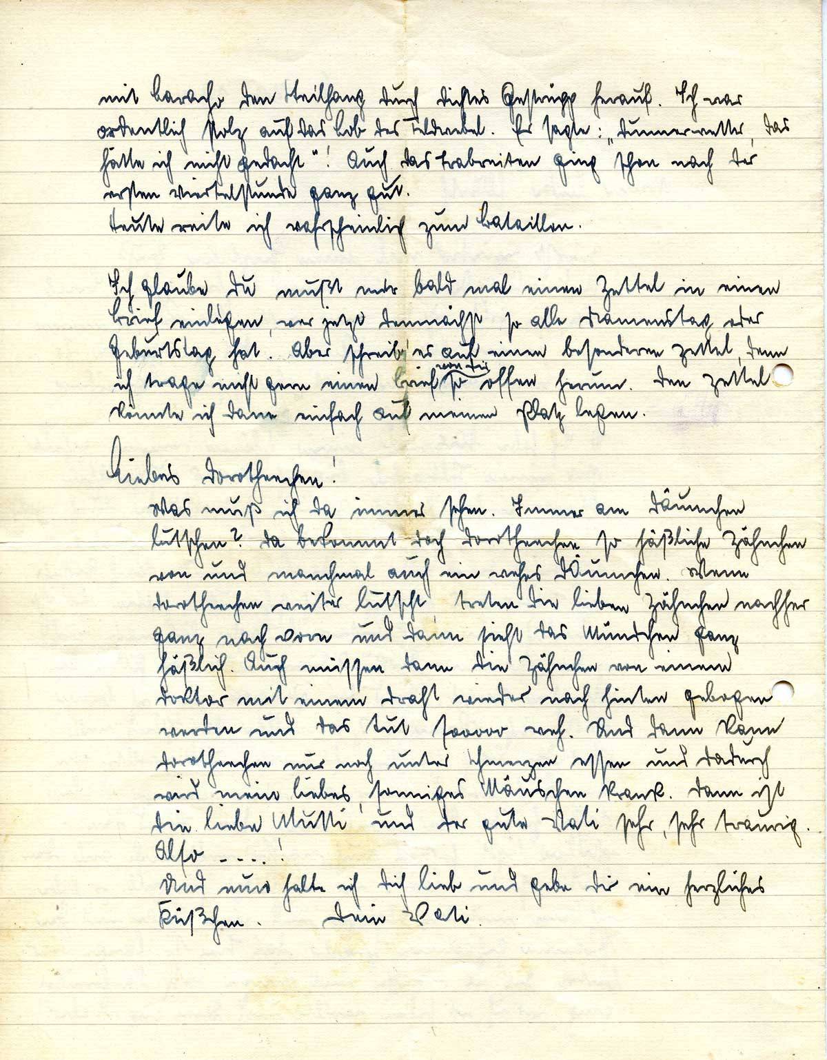 Zuerst wieder mal einen herzlichen Gruß. Und vielen Dank für Deinen letzten schönen Brief. Na, die Hilde ist ja eine nette Marke, ich meine von wegen Haar ondulieren. Das mußt Du ihr aber von vornherein nett, aber sicher, abgewöhnen.