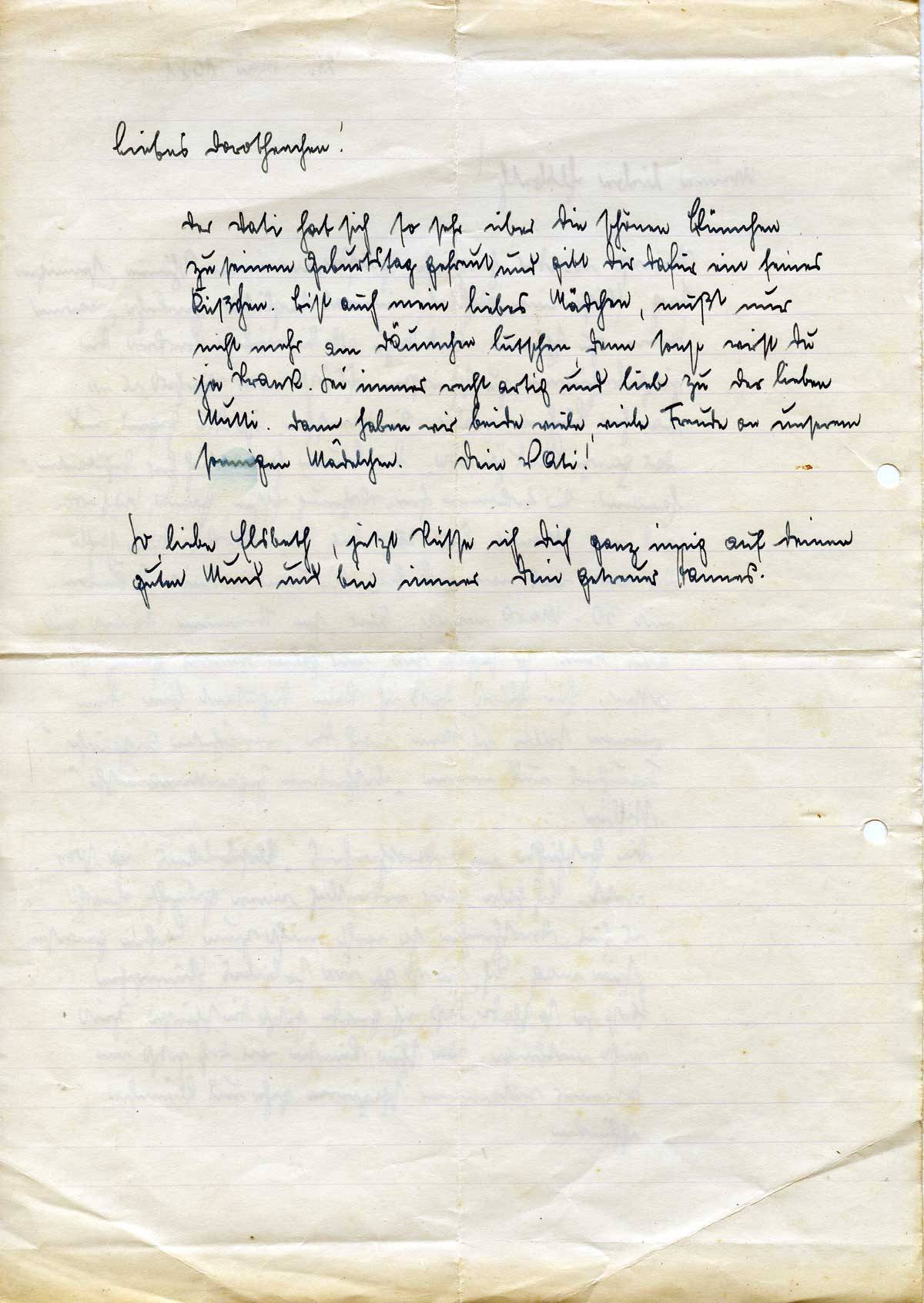 Der Vati hat sich so sehr über die schönen Blümchen zu seinem Geburtstag gefreut und gibt Dir dafür ein feines Küßchen. Bist auch mein liebes Mädchen, mußt nur nicht mehr am Däumchen lutschen, denn sonst wirst Du ja krank. Sei immer recht artig und lieb zu der lieben Mutti. Dann haben wir beide viele, viele Freude an unserem sonnigen Mädchen.