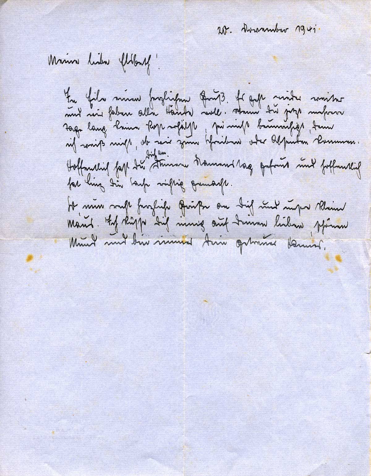 So, nun recht herzliche Grüße an Dich und unsere kleine Maus. Ich küsse Dich innig auf Deinen lieben, schönen Mund und bin immer Dein getreuer Hannes.