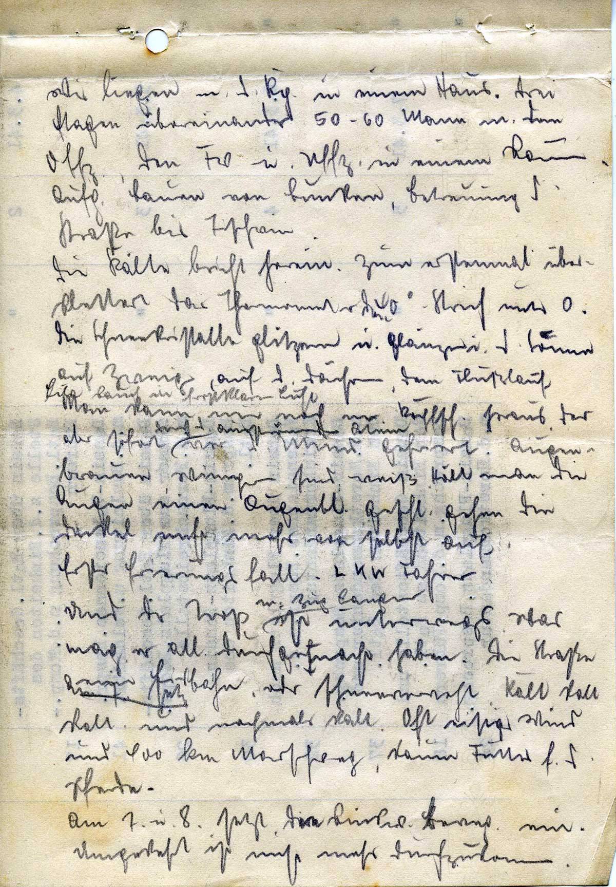 Die Kälte bricht herein. Zum ersten mal überklettert das Thermometer den 40 o Strich unter 0. Die Schneekristalle glitzern u. glänzen i. d. Sonne, auf Zweigen, auf d. Dächern, dem Flußlauf Lila Rauch in frostklarer Luft. Man kann nur noch m. Kopfsch. heraus. der aber sofort durch d. ausströmenden Atem vor d. Mund gefriert. Augenbrauen, Wimpern sind weiß. Hält man die Augen einen Augenbl. geschl. gehen die Deckel nicht mehr von selbst auf. Erster Erfrierungsfall. LKW Fahrer.