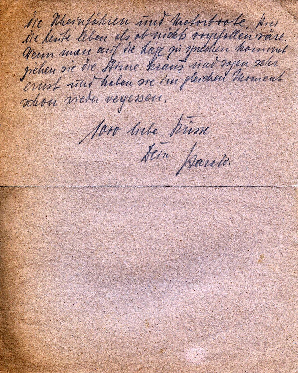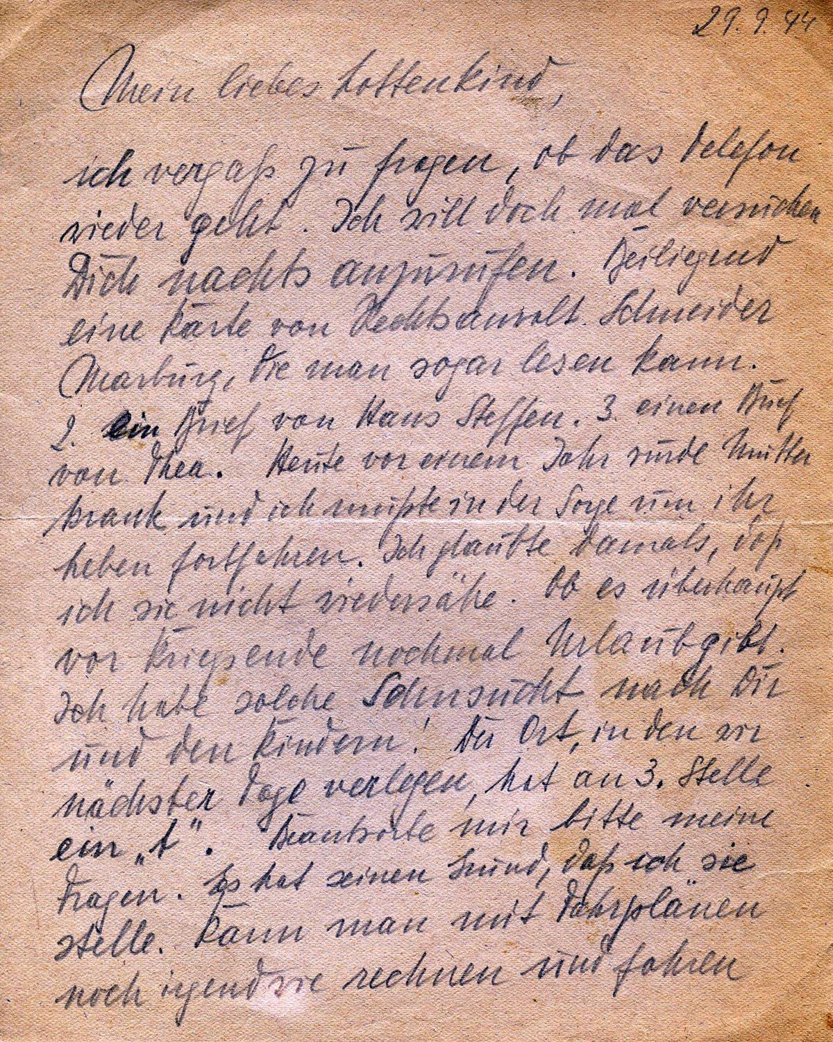 ich vergaß zu fragen, ob das Telefon wieder geht. Ich will doch mal versuchen, Dich nachts anzurufen. Beiliegend eine Karte von Rechtsanwalt Schneider Marburg, die man sogar lesen kann. 2. ein Brief von Hans Steffen 3. eine Brief von Thea. Heute vor einem Jahr wurde Mutter krank und ich mußte in der Sorge um ihr Leben fortfahren. Ich glaubte damals, daß ich sie nicht wiedersähe. Ob es überhaupt vor Kriegsende nochmal Urlaub gibt. Ich habe solche Sehnsucht nach Dir und den Kindern! Der Ort, in den wir nächste Tage verlegen, hat an 3. Stelle ein „t“. Beantworte mir bitte meine Fragen. Es hat seinen Grund, daß ich sie stelle.