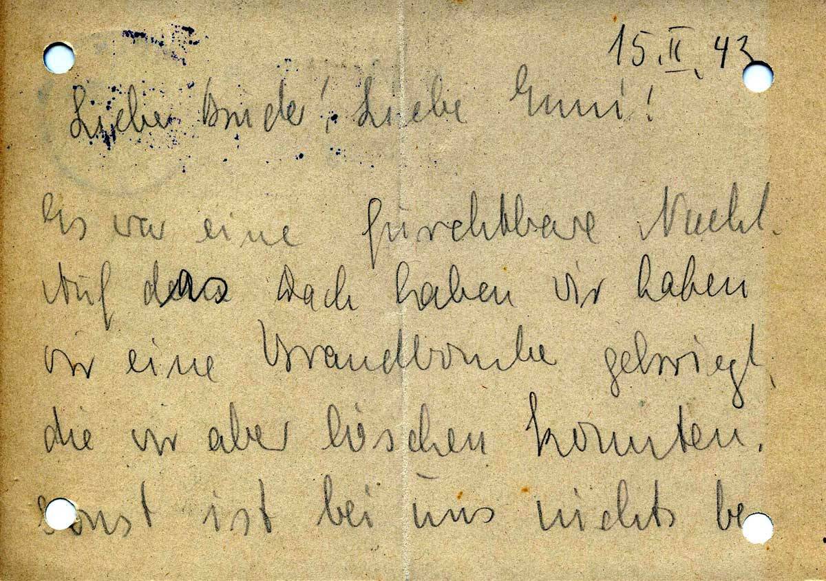 Es war eine furchtbare Nacht. Auf das Dach haben wir eine Brandbombe gekriegt, die wir aber löschen konnten. Sonst ist bei uns nichts be-