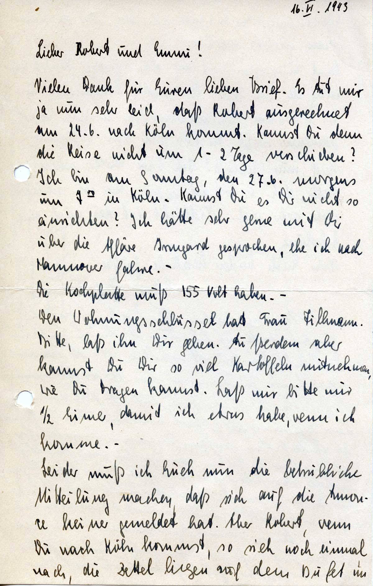 Vielen Dank für Euren lieben Brief. Es tut mir ja nun sehr leid, daß Robert ausgerechnet am 24.6. nach Köln kommt. Kannst Du denn die Reise nicht um 1-2 Tage verschieben? Im bin am Sonntag, den 27.6. morgens um 7.00 in Köln. Kannst Du es Dir nicht so einrichten? Ich hätte sehr gerne mit Dir über die Affäre Irmgard gesprochen, ehe ich nach Hannover fahre. –