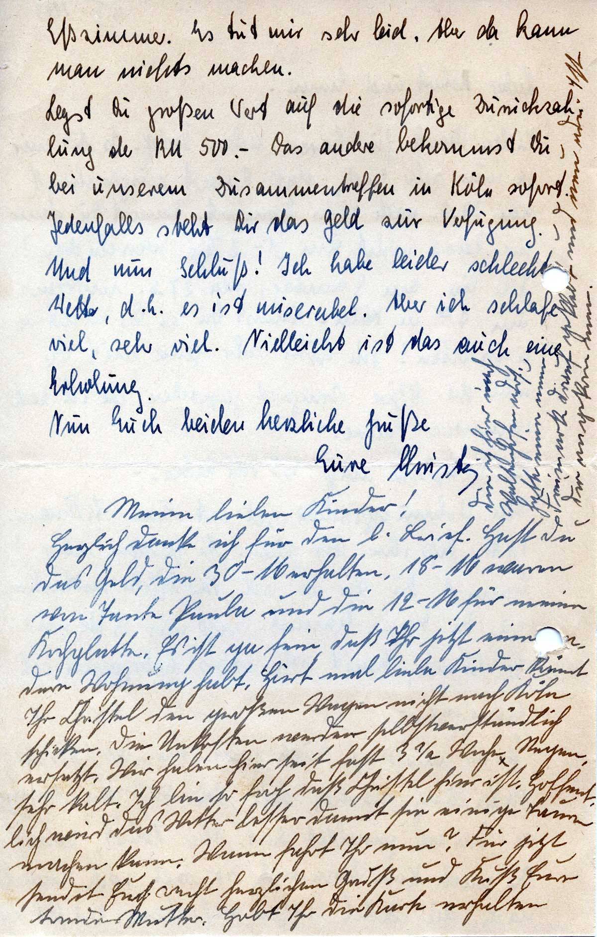 Legst Du großen Wert auf die sofortige Zurückzahlung der RM 500,- Das andere bekommst Du bei unserem Zusammentreffen in Köln sofort. Jedenfalls steht Dir das Geld zur Verfügung. Und nun Schluß! Ich habe leider schlechtes Wetter, d. h. es ist miserabel. Aber ich schlafe viel, sehr viel. Vielleicht ist das auch eine Erholung.