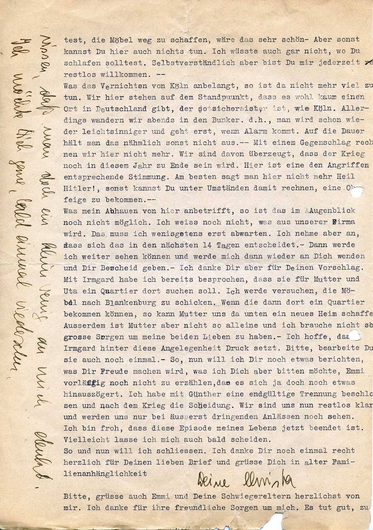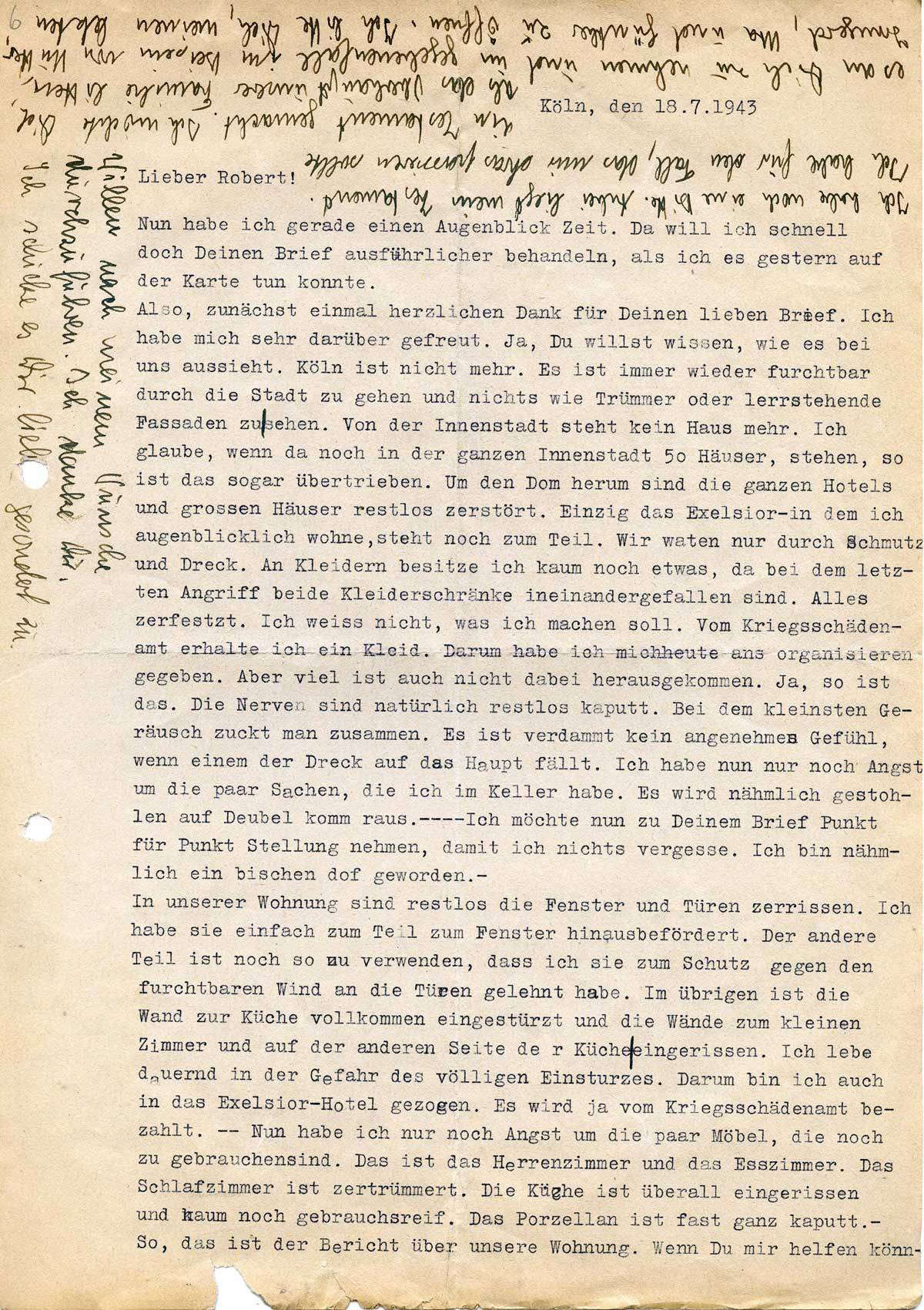 Nun habe ich gerade einen Augenblick Zeit. Da will ich schnell doch Deinen Brief ausführlicher behandeln, als ich es gestern auf der Karte tun konnte. Also, zunächst einmal herzlichen Dank für Deinen lieben Brief. Ich habe mich sehr darüber gefreut. Ja, Du willst wissen, wie es bei uns aussieht. Köln ist nicht mehr. Es ist immer wieder furchtbar durch die Stadt zu gehen und nichts wie Trümmer oder leerstehende Fassaden zu sehen. Von der Innenstadt steht kein Haus mehr. Ich glaube, wenn da noch in der ganzen Innenstadt 50 Häuser stehen, so ist das sogar übertrieben. Um den Dom herum sind die ganzen Hotels und grossen Häuser restlos zerstört. Einzig das Exelsior -–in dem ich augenblicklich wohne, steht noch zum Teil. Wir waten nur durch Schmutz und Deck. An Kleidern besitze ich kaum noch etwas, da bei dem letzten Angriff beide Kleiderschränke ineinandergefallen sind. Alles zerfetzt. Ich weiss nicht, was ich machen soll. Vom Kriegsschädenamt erhalte ich ein Kleid. Darum habe ich mich heute ans organisieren gegeben. Aber viel ist auch nicht dabei herausgekommen. Ja, so ist das. Die Nerven sind natürlich restlos kaputt. Bei dem kleinsten Geräusch zuckt man zusammen. Es ist verdammt kein angenehmes Gefühl, wenn einem der Dreck auf das Haupt fällt. Ich habe nun nur noch Angst um die paar Sachen, die ich im Keller habe. Es wird nämlich gestohlen auf Deubel komm raus. - - - Ich möchte nun zu Deinem Brief Punkt für Punkt Stellung nehmen, damit ich nichts vergesse. Ich bin nämlich ein bischen dof geworden.