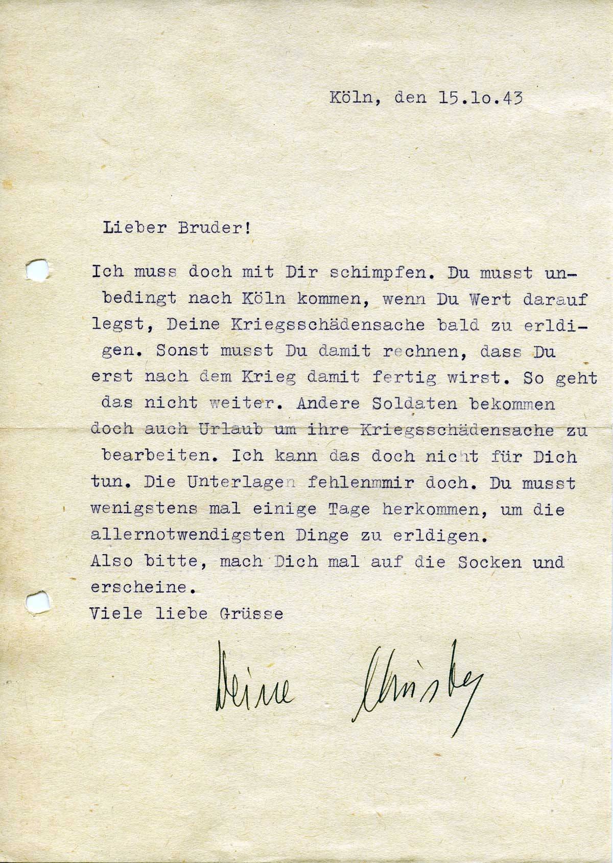 Ich muss doch mit Dir schimpfen. Du musst unbedingt nach Köln kommen, wenn Du wert darauf legst, Deine Kriegsschädensache bald zu erledigen. Sonst musst Du damit rechnen, dass Du erst nach dem Krieg damit fertig wirst. So geht das nicht weiter. Andere Soldaten bekommen doch auch Urlaub um ihre Kriegsschädensache zu bearbeiten. Ich kann das doch nicht für Dich tun. Die Unterlagen fehlen mir doch. Du musst wenigstens mal einige Tage herkommen, um die allernotwendigsten Dinge zu erledigen.