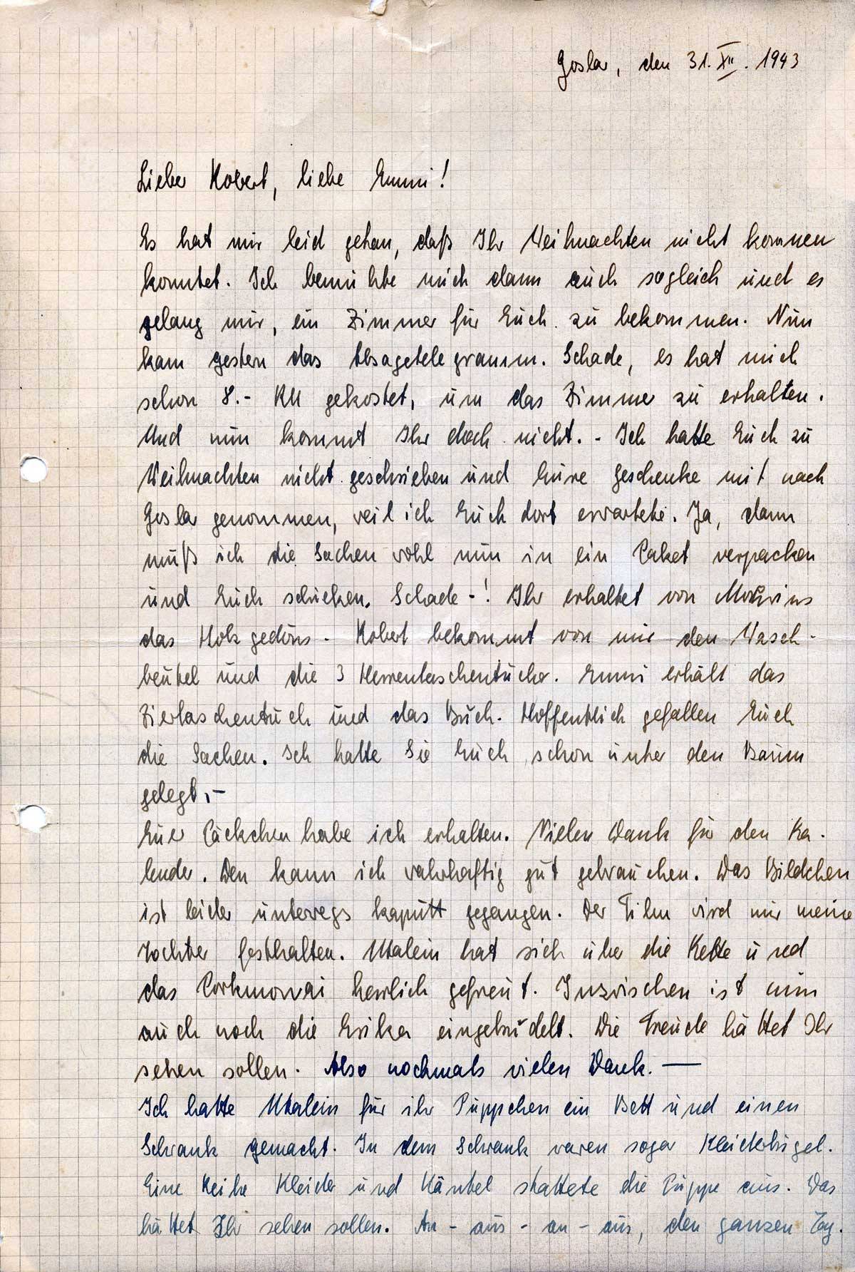 Es hat mir leid getan, daß Ihr Weihnachten nicht kommen konntet. Ich bemühte mich dann auch sogleich und es gelang mir, ein Zimmer für Euch zu bekommen. Nun kam gestern das Absagetelegramm. Schade, es hat mich schon 8.- RM gekostet, um das Zimmer zu erhalten. Und nun kommt Ihr doch nicht. – Ich hatte Euch zu Weihnachten nicht geschrieben und Eure Geschenke mit nach Goslar genommen, weil ich Euch dort erwartete. Ja, dann muß ich die Sachen wohl nun in ein Paket verpacken und Euch schicken. Schade-! Ihr erhaltet von Mehrins das Holzgedöns – Robert bekommt von mir den Waschbeutel und die 3 Herrentaschentücher. Mummi erhält das Ziertaschentuch und das Buch. Hoffentlich gefallen Euch die Sachen. Ich hatte Sie Euch schon unter den Baum gelegt. –