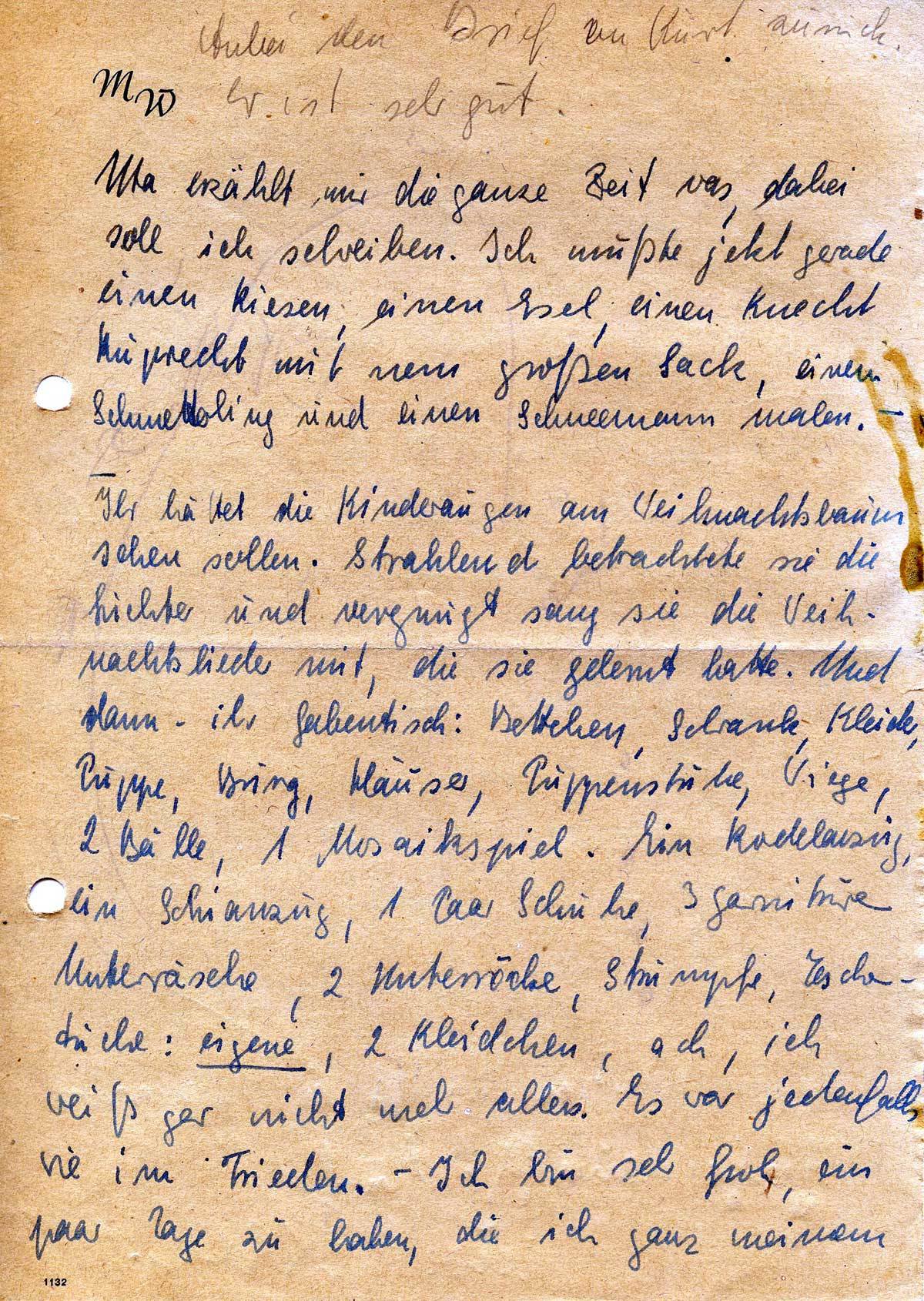 Ihr hättet die Kinderaugen am Weihnachtsbaum sehen sollen. Strahlend betrachtete sie die Lichter und vergnügt sang sie die Weihnachtslieder mit, die sie gelernt hatte. Und dann – ihr Gabentisch: Bettchen, Schrank, Kleider, Puppe, Burg, Häuser, Puppenstube, Wiege, 2 Bälle, 1 Mosaikspiel. Ein Rodelanzug, ein Schianzug, 1 Paar Schuhe, 3 Garnituren Unterwäsche, 2 Unterröcke, Strümpfe, Taschentücher: eigene, 2 Kleidchen, ach, ich weiß gar nicht mehr alles. Es war jedenfalls wie im Frieden. – Ich bin sehr froh, ein paar Tage zu haben, die ich ganz meinem