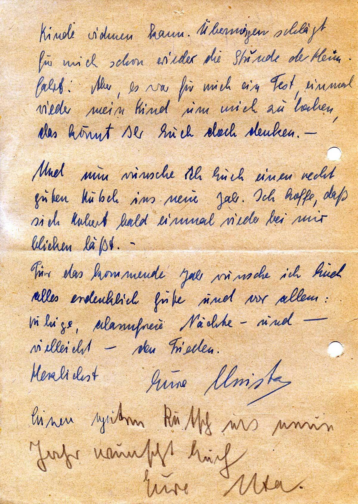 Kinde widmen kann. Übermorgen schlägt für mich schon wieder die Stunde der Heimfahrt. Aber, es war für mich ein Fest, einmal wieder mein Kind um mich zu haben, das könnt Ihr Euch doch denken. –
