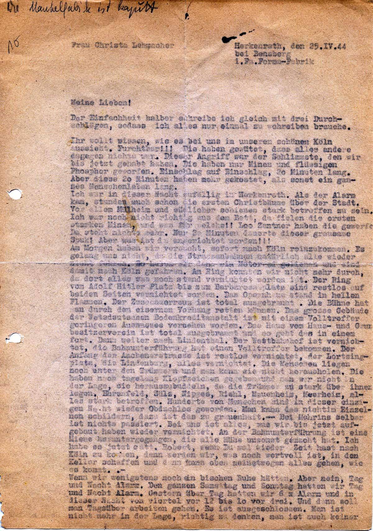 Ihr sollt wissen, wie es bei uns in unserem schönen Köln aussieht. Furchtbar!! Die haben gewütet, dass alles andere dagegen nichts war. Dieser Angriff war der Schlimmste, den wir bis jetzt gehabt haben. Die haben nur Minen und flüssigen Phosphor geworfen. Einschlag auf Einschlag, 20 Minuten lang. Aber diese 20 Minuten haben mehr gekostet, als sonst ein ganzes Menschenleben lang.