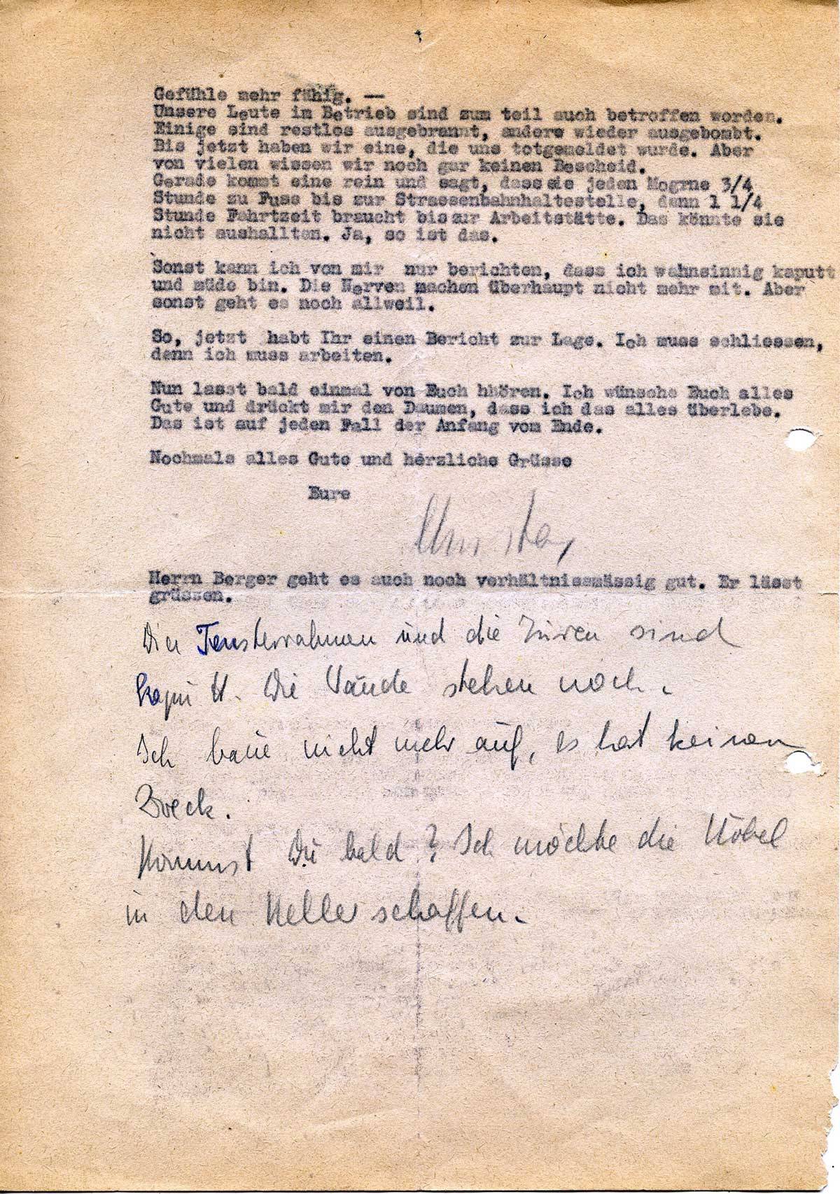 Unsere Leute im Betrieb sind zum Teil auch betroffen worden. Einige sind restlos ausgebrannt, andere wieder ausgebombt. Bis jetzt haben wir eine, die uns totgemeldet wurde. Aber von vielen wissen wir noch gar keinen Bescheid.