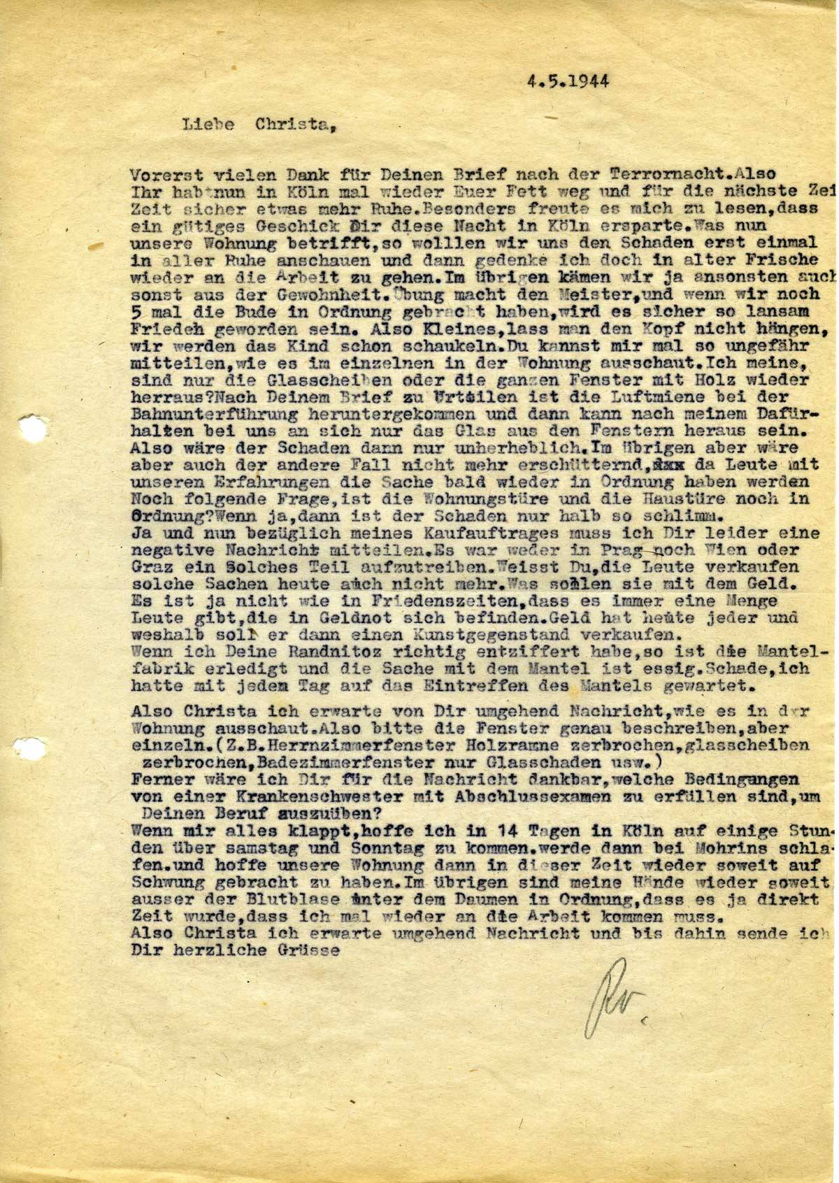 vorerst vielen Dank für Deinen Brief nach der Terrornacht. Also Ihr habt nun in Köln mal wieder Euer Fett weg und für die nächst Zeit sicher etwas mehr Ruhe. Besonders freut es mich zu lesen, dass ein gütiges Geschick Dir diese Nacht in Köln ersparte. Was nun unsere Wohnung betrifft, so wollen wir uns den Schaden erst einmal in aller Ruhe anschauen und dann gedenke ich doch in alter Frische wieder an die Arbeit zu gehen. Im übrigen kämen wir ja ansonsten auch sonst aus der Gewohnheit. Übung macht den Meister, und wenn wir noch 5 mal die Bude in Ordnung gebracht haben, wird es sicher so langsam Frieden geworden sein. Also Kleines, lass man den Kopf nicht hängen, wir werden das Kind schon schaukeln. Du kannst mir mal so ungefähr mitteilen, wie es im einzelnen in der Wohnung ausschaut. Ich meine, sind nur die Glasscheiben oder die ganzen Fenster mit Holz wieder heraus? Nach Deinem Brief zu urteilen ist die Luftmiene bei der Bahnunterführung heruntergekommen und dann kann nach meinem Dafürhalten bei uns an sich nur das Glas aus den Fenstern heraus sein. Also wäre der Schaden dann nur unerheblich. Im übrigen aber wäre auch der andere Fall nicht mehr erschütternd, da Leute mir unseren Erfahrungen die Sache bald wieder in Ordnung haben werden. Noch folgende Frage, ist die Wohnungstüre und die Haustüre noch in Ordnung? Wenn ja, dann ist der Schaden nur halb so schlimm.