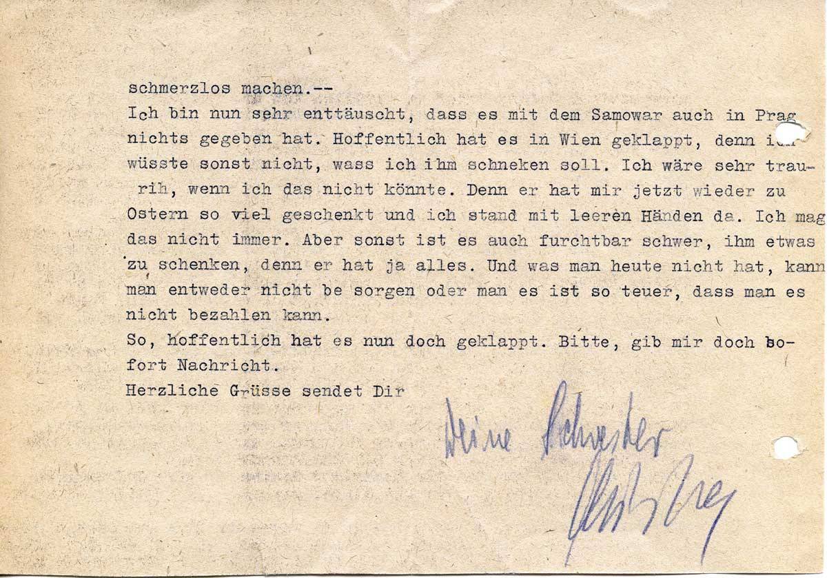 Ich bin nun sehr enttäuscht, dass es mit dem Samowar auch in Prag nichts gegeben hat. Hoffentlich hat es in Wien geklappt, denn ich wüsste sonst nicht, was ich ihm schenken soll. Ich wäre sehr traurig, wenn ich das nicht könnte. Denn er hat mir jetzt wieder zu Ostern so viel geschenkt und ich stand mit leeren Händen da. Ich mag das nicht immer. Aber sonst ist es auch furchtbar schwer, ihm etwas zu schenken, denn er hat ja alles. Und was man heute nicht hat, kann man entweder nicht besorgen oder man es ist so teuer, dass man es nicht bezahlen kann.