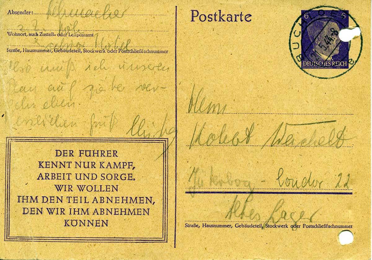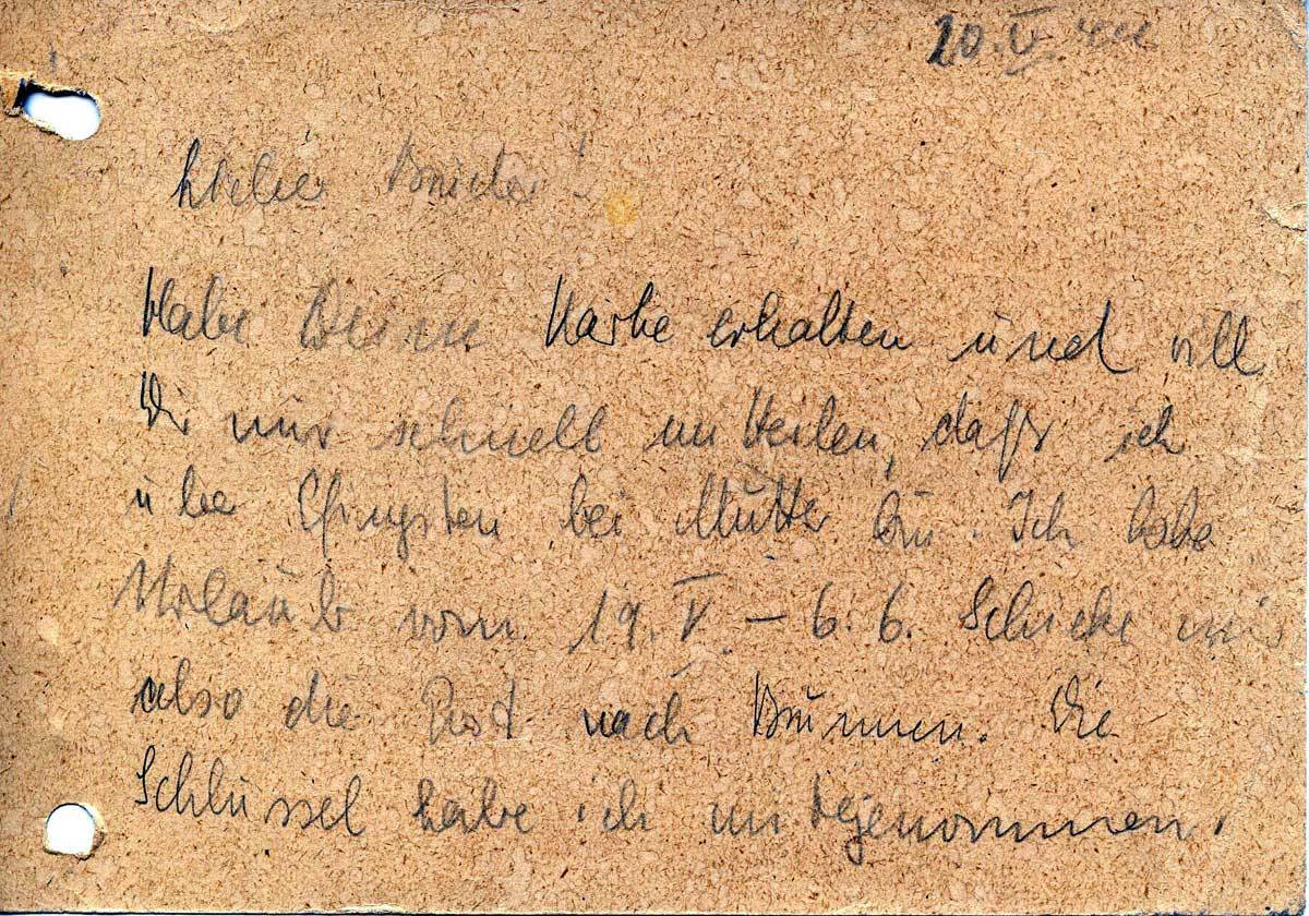 Habe Deine Karte erhalten und will Dir nur schnell mitteilen, dass ich über Pfingsten bei Mutter bin. Ich habe Urlaub vom 19.V. – 6.6. Schicke mir also die Post nach Brumen [?]. Die Schlüssel habe ich mitgenommen.