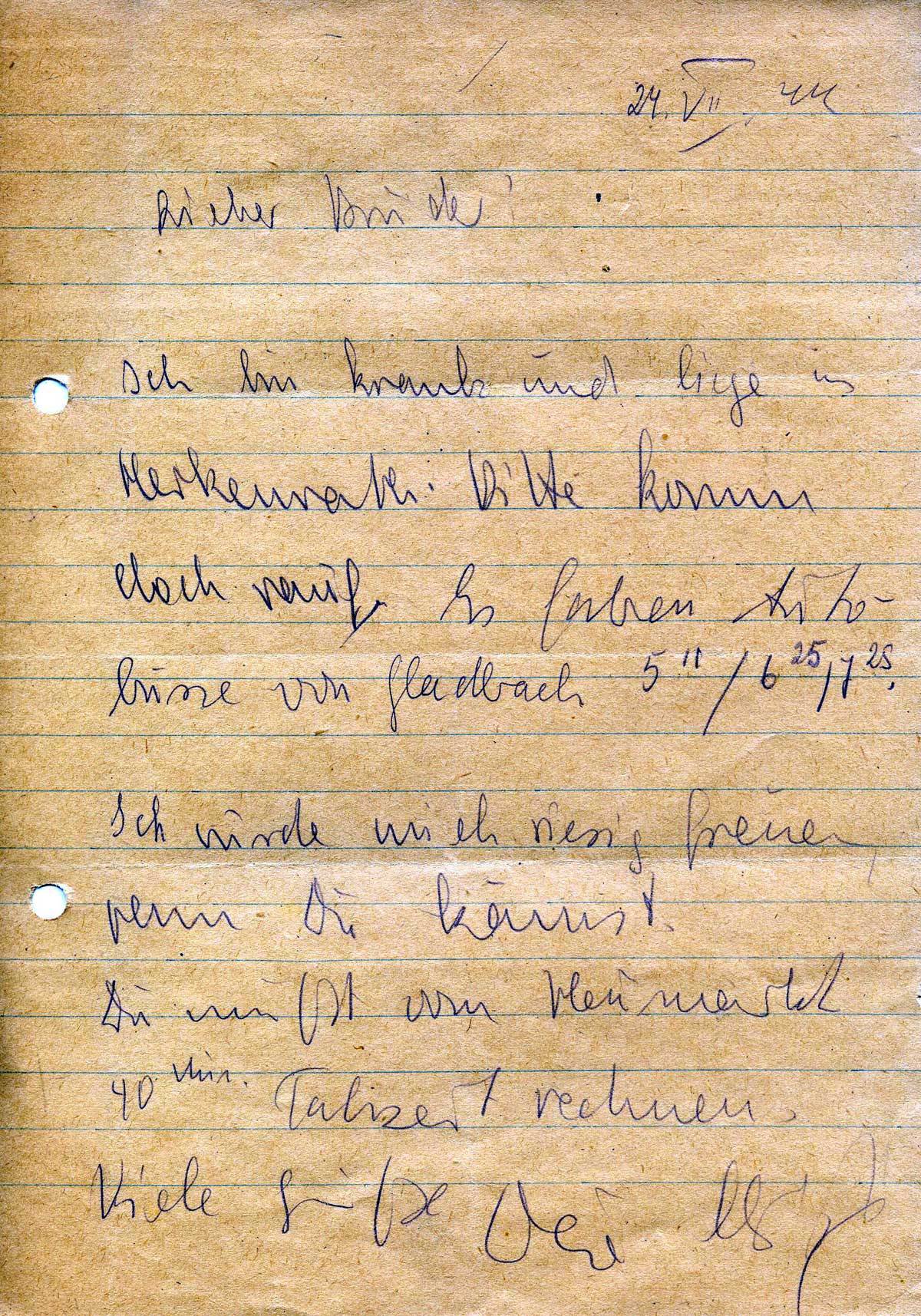 Ich bin krank und liege in Herkenrath. Bitte komm doch rauf. Es fahren Autobusse von Gladbach 5.11 / 6.25 / 7.25.