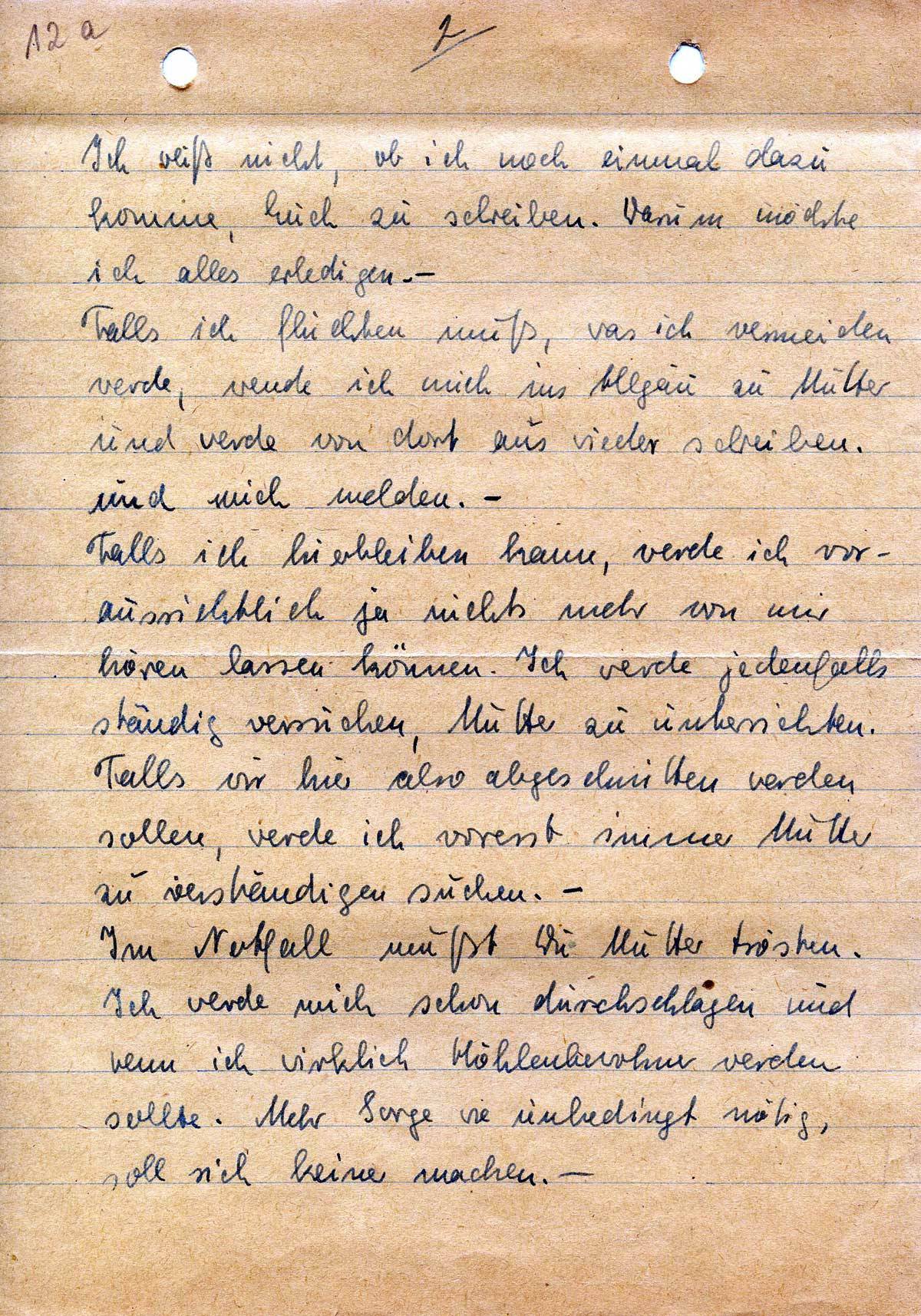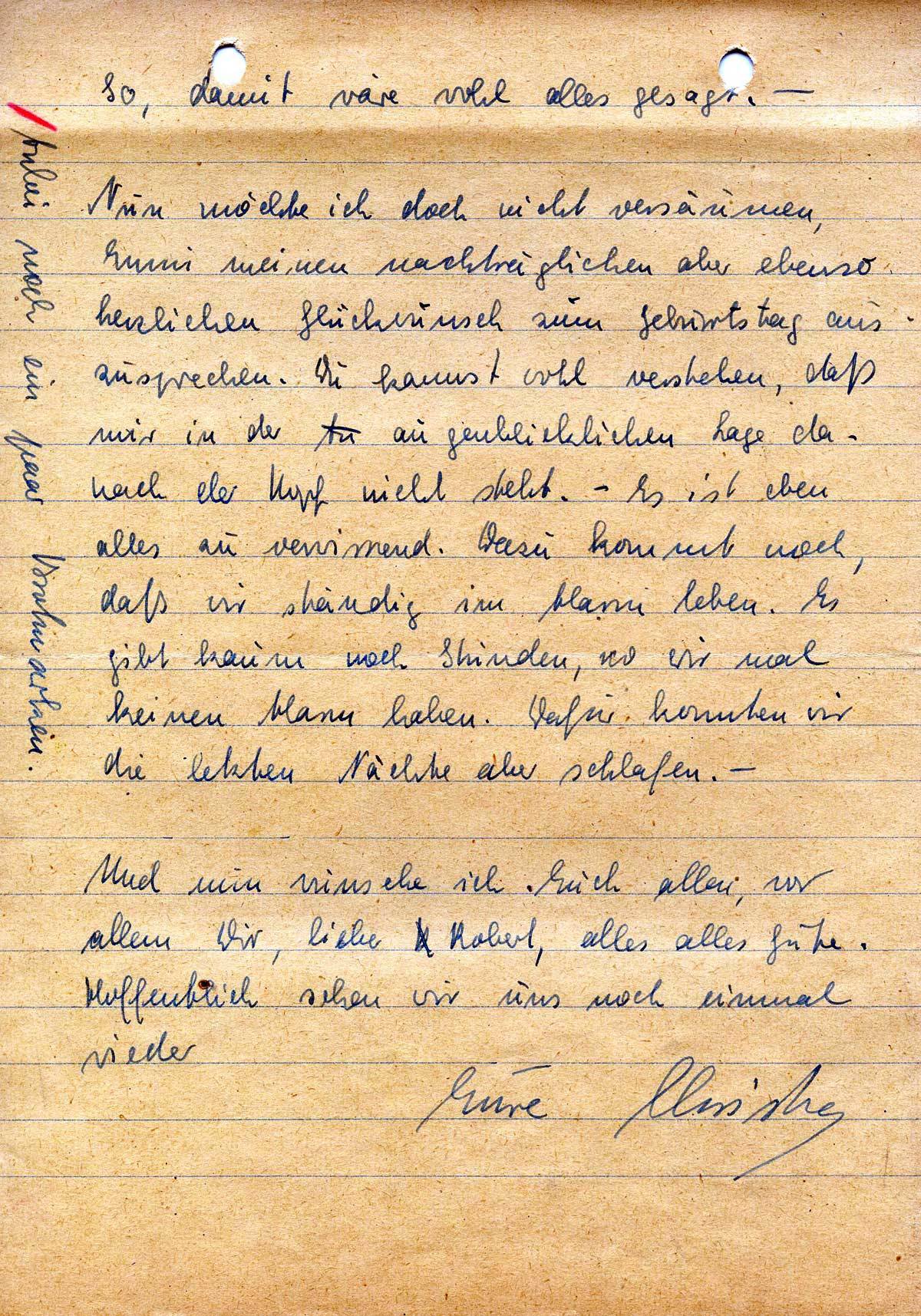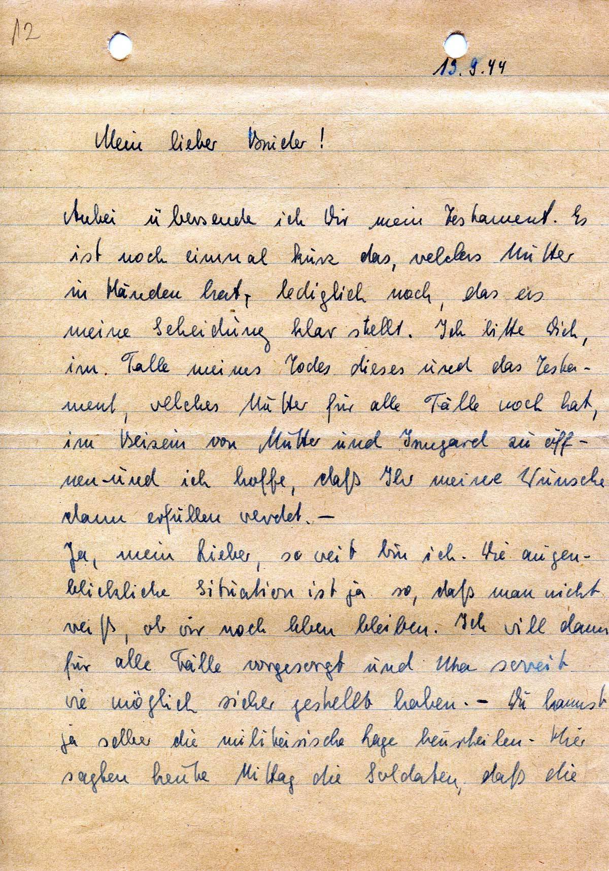 Anbei übersende ich Dir mein Testament. E ist noch einmal kurz das, welches Mutter in Händen hat, lediglich noch, das es meine Scheidung klar stellt. Ich bitte Dich, im Falle meines Todes dieses und das Testament, welches Mutter für alle Fälle noch hat, im Beisein von Mutter und Irmgard zu öffnen – und ich hoffe, daß ihr meine Wünsche dann erfüllen werdet. –
