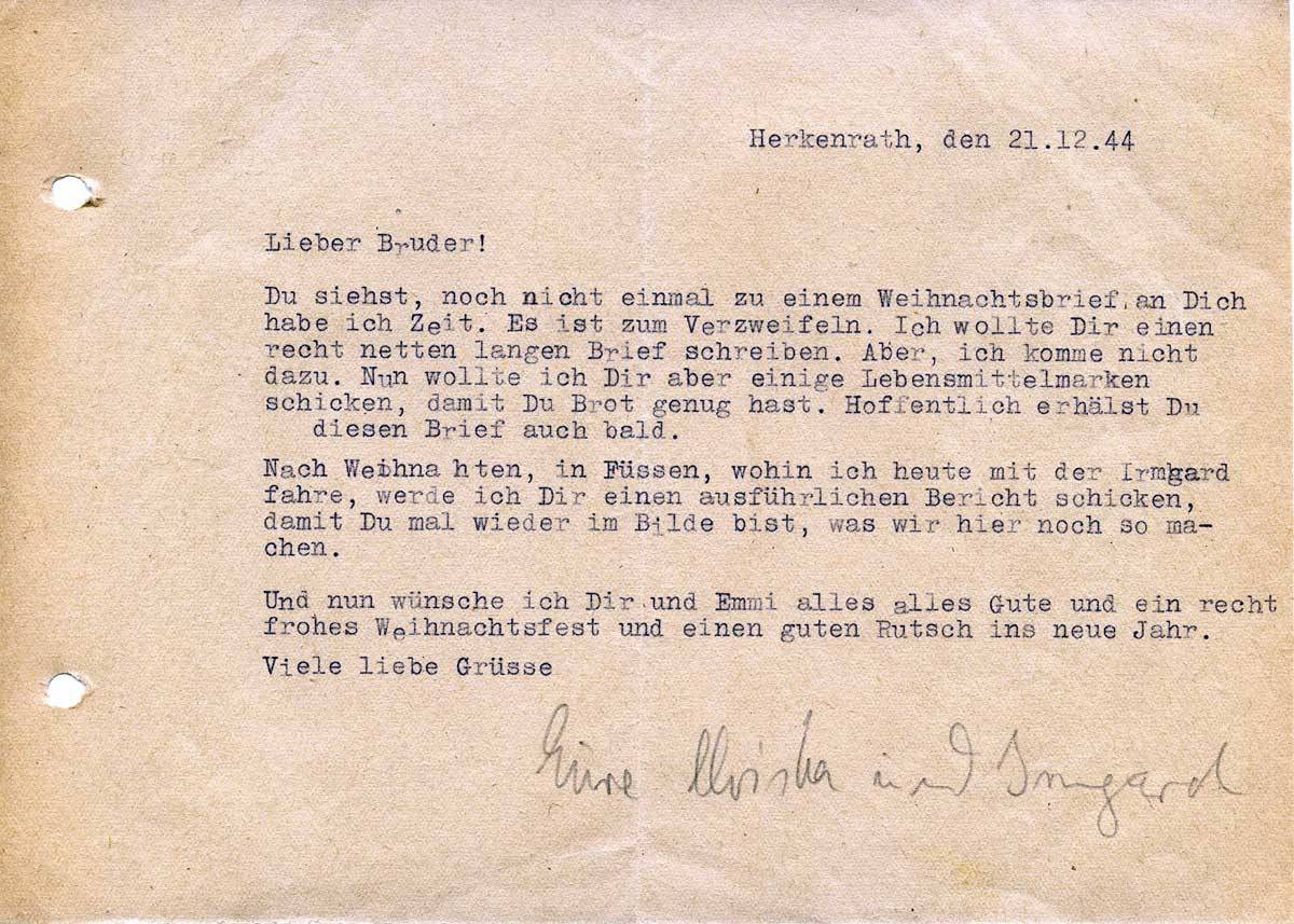 Nach Weihnachten, in Füssen, wohin ich heute mit der Irmgard fahre, werde ich Dir einen ausführlichen Bericht schicken, damit Du Brot genug hast. Hoffentlich erhältst Du diesen Brief auch bald.