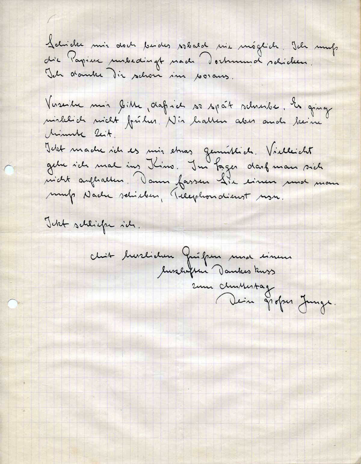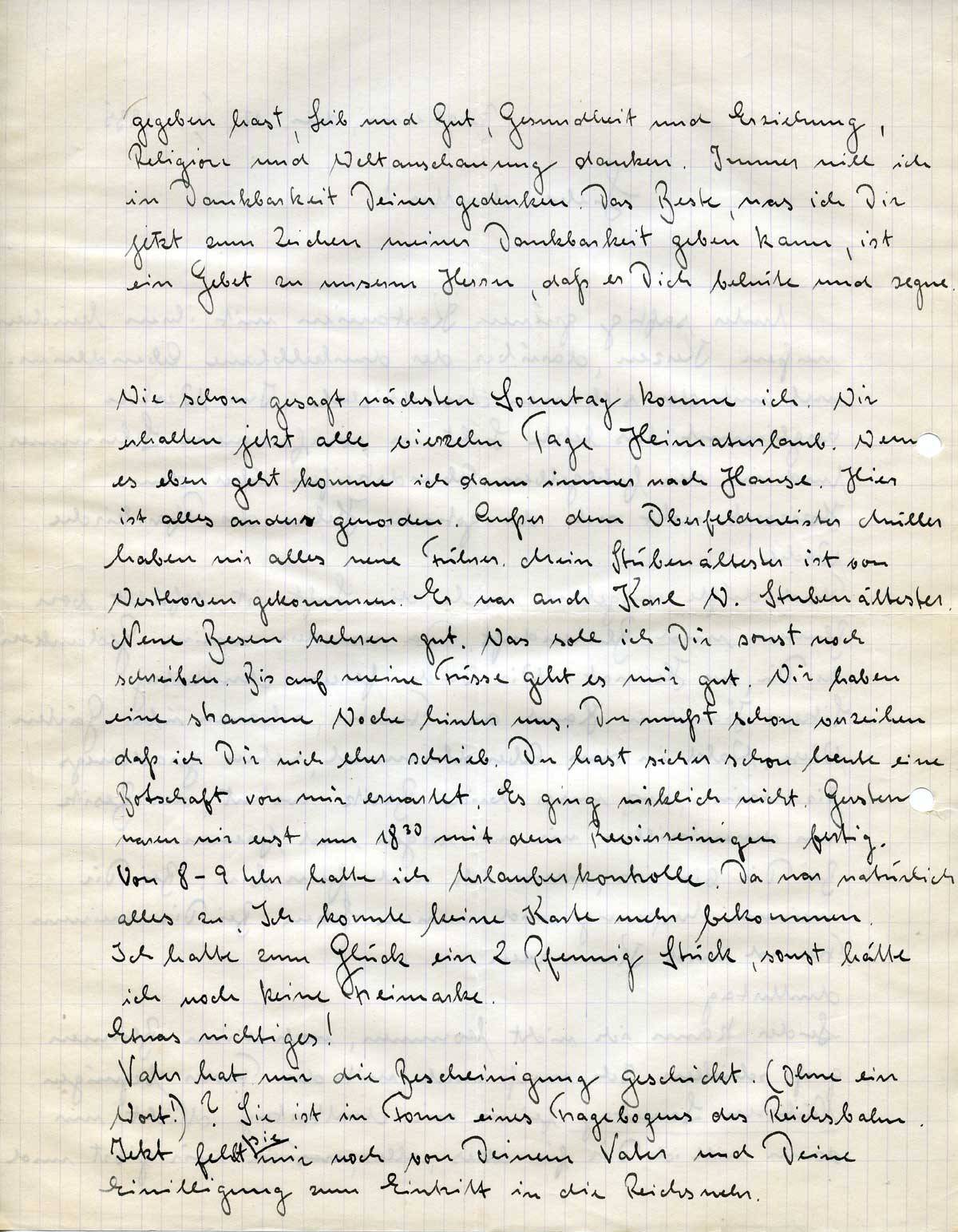 Wie schon gesagt nächsten Sonntag komme ich. Wir erhalten jetzt alle vierzehn Tage Heimaturlaub. Wenn es eben geht komme ich dann immer nach Hause. Hier ist alles anders geworden. Außer dem Oberfeldmeister Müller haben wir alles neue Führer. Mein Stubenältester ist von Westhoven gekommen. Er war an der Karl W. Stubenältester. Neue Besen kehren gut. Was soll ich Dir sonst noch schreiben. Bis auf meine Füsse geht es mirgut. Wir haben eine stramme Woche hinter uns. Du mußt schon verzeihen daß ich Dir nicht eher schrieb. Du hast sicher schon heute eine Botschaft von mir erwartet. Es ging wirklich nicht. Gestern waren wir erst um 18.30 mit dem Revierreinigen fertig. Von 8-9 Uhr hatte ich Urlauberkontrolle. Da war natürlich alles zu. Ich konnte keine Karte mehr bekommen. Ich hatte zum Glück ein 2 Pfennig Stück, sonst hätte ich noch keine Freimarke.