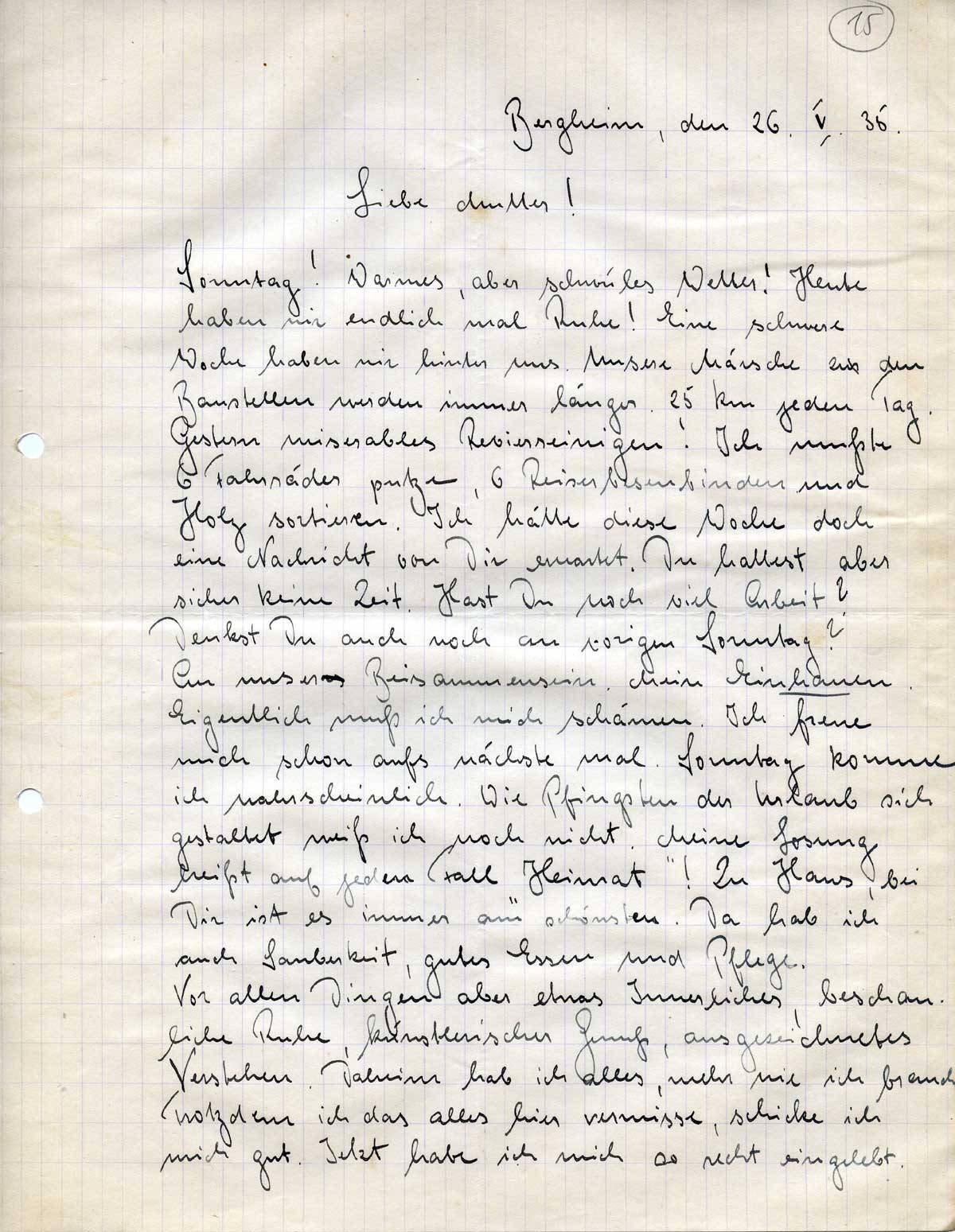 Sonntag! Warmes, aber schwüles Wetter! Heute haben wir endlich mal Ruhe! Eine schwere Woche haben wir hinter uns. Unsere Märsche zu den Baustellen werden immer länger. 25 km jeden Tag. Gestern miserables Revierreinigen! Ich mußte 6 Fahrräder putzen, 6 Reiserbesen binden und Holz sortieren. Ich hätte diese Woche doch eine Nachricht von Dir erwartet. Du hattest aber sicher keine Zeit. Hast Du noch viel Arbeit?