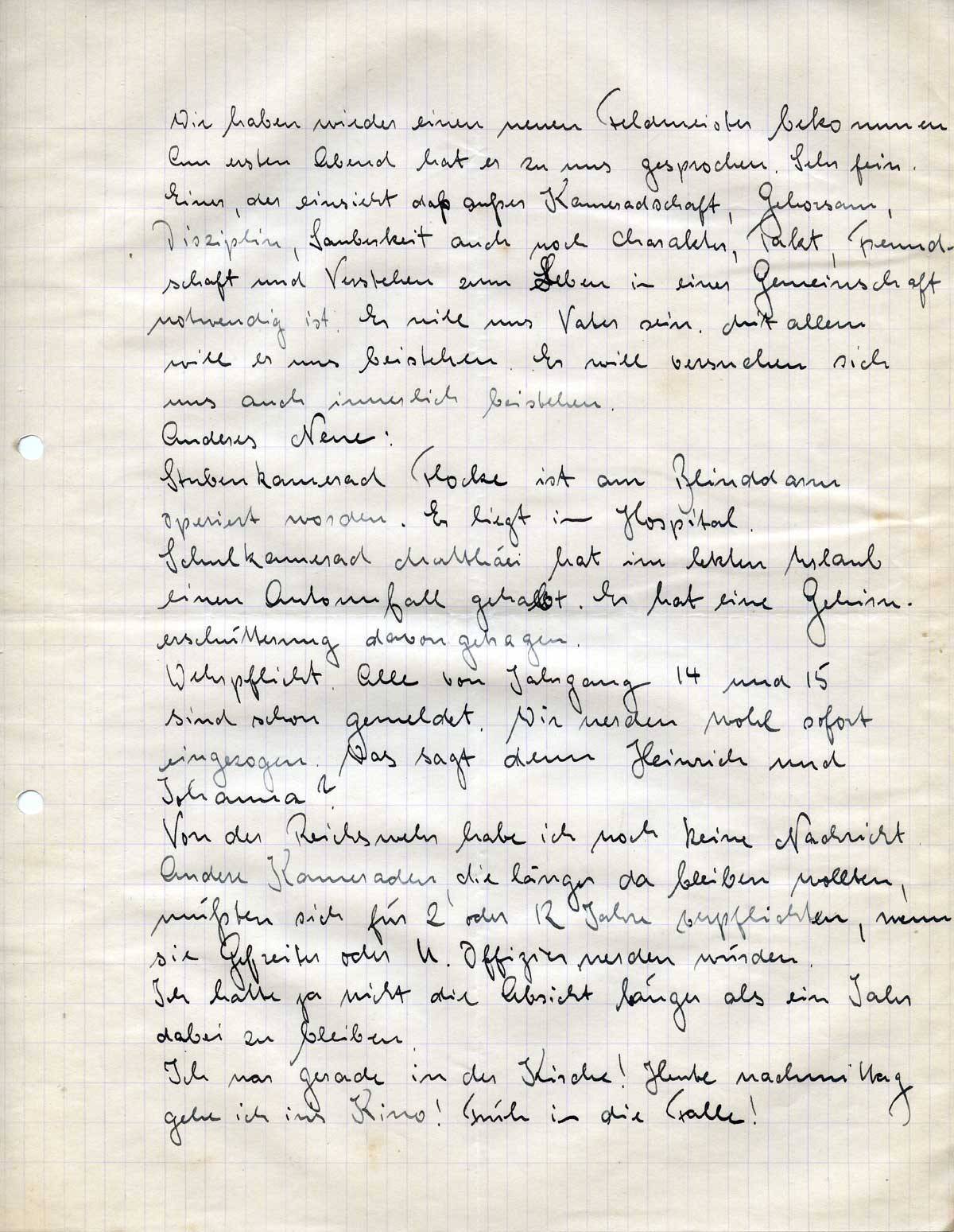 Wir haben wieder einen neuen Feldmeister bekommen. Am ersten Abend hat er zu uns gesprochen. Sehr fein. Einer, der einsieht daß außer Kameradschaft, Gehorsam, Disziplin, Sauberkeit auch noch Charakter, Takt, Freundschaft und Verstehen zum Leben in einer Gemeinschaft notwendig ist. Er will uns Vater sein. Mit allem will er uns beistehen. Er will versuchen sich uns auch innerlich beistehen.