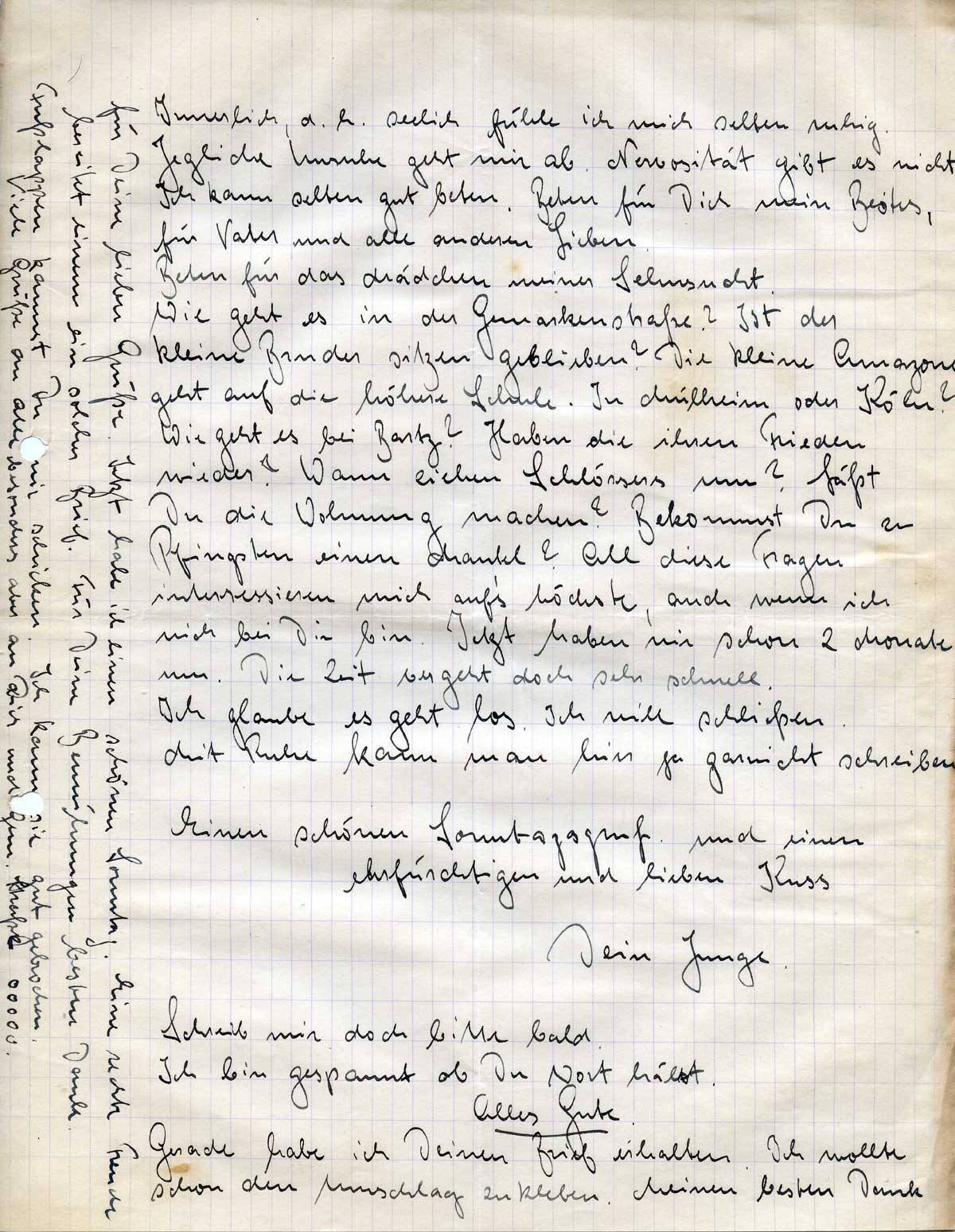 Denkst Du auch noch an vorigen Sonntag? An unser Beisammensein. Mein Einhauen[?]. Eigentlich muß ich mich schämen. Ich freue mich schon aufs nächste mal. Sonntag komme ich wahrscheinlich. Wie Pfingsten der Urlaub sich gestaltet weiß ich noch nicht. Meine Losung heißt auf jeden Fall „Heimat“! Zu Haus, bei Dir ist es immer am schönsten. Da hab ich auch Sauberkeit, gutes Essen und Pflege.