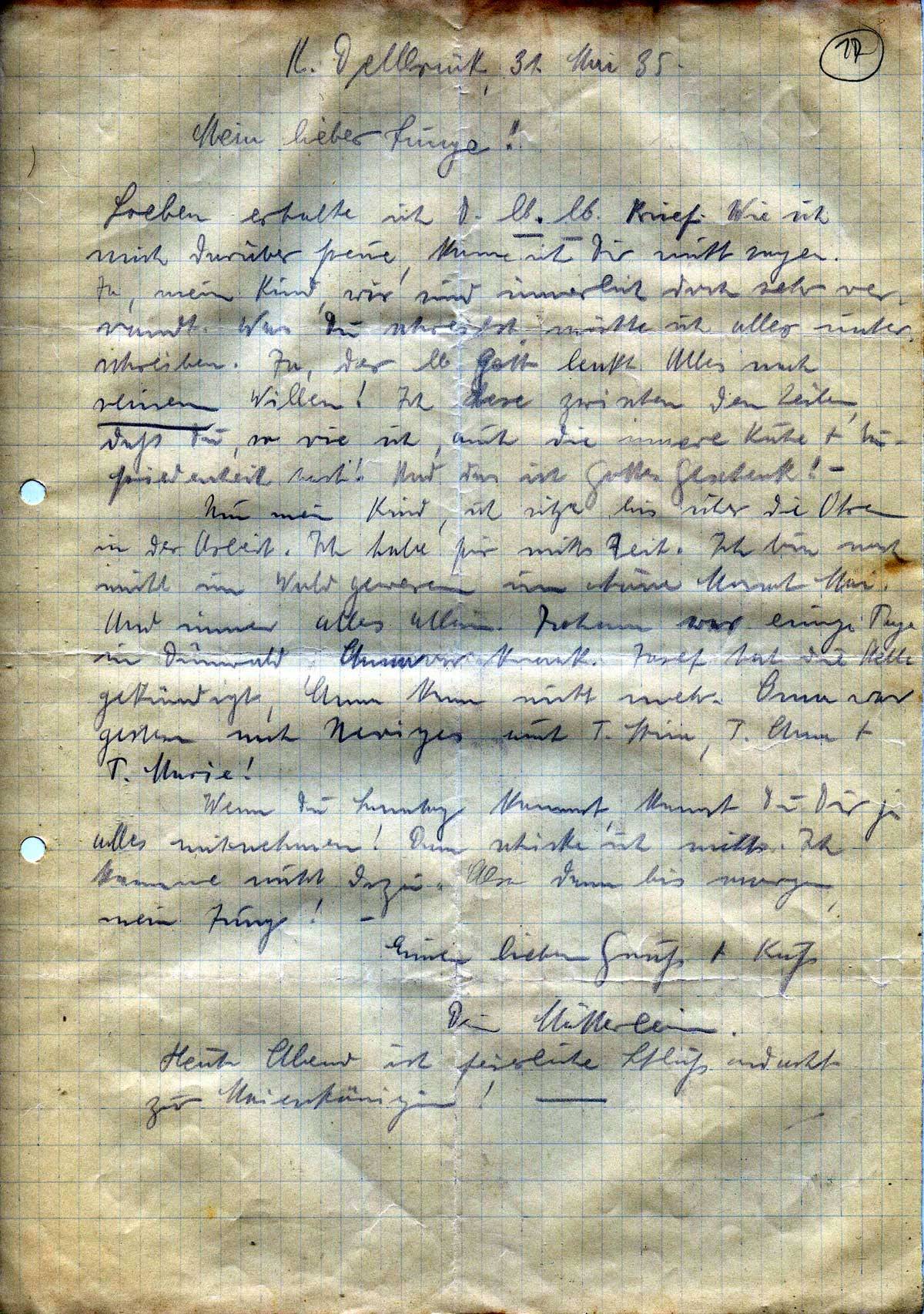 Nun mein Kind, ich sitze bis über die Ohren in der Arbeit. Ich habe für nichts Zeit. Ich bin noch nicht im Wald gewesen im schönen Monat Mai. Und immer alles allein. Johanna war einige Tage in Dünwald. Anna war krank. Josef hat die Stelle gekündigt, Anne kann nicht mehr. Oma war gestern nach Neriges mit T. Stina, T. Anna + T. Marie!