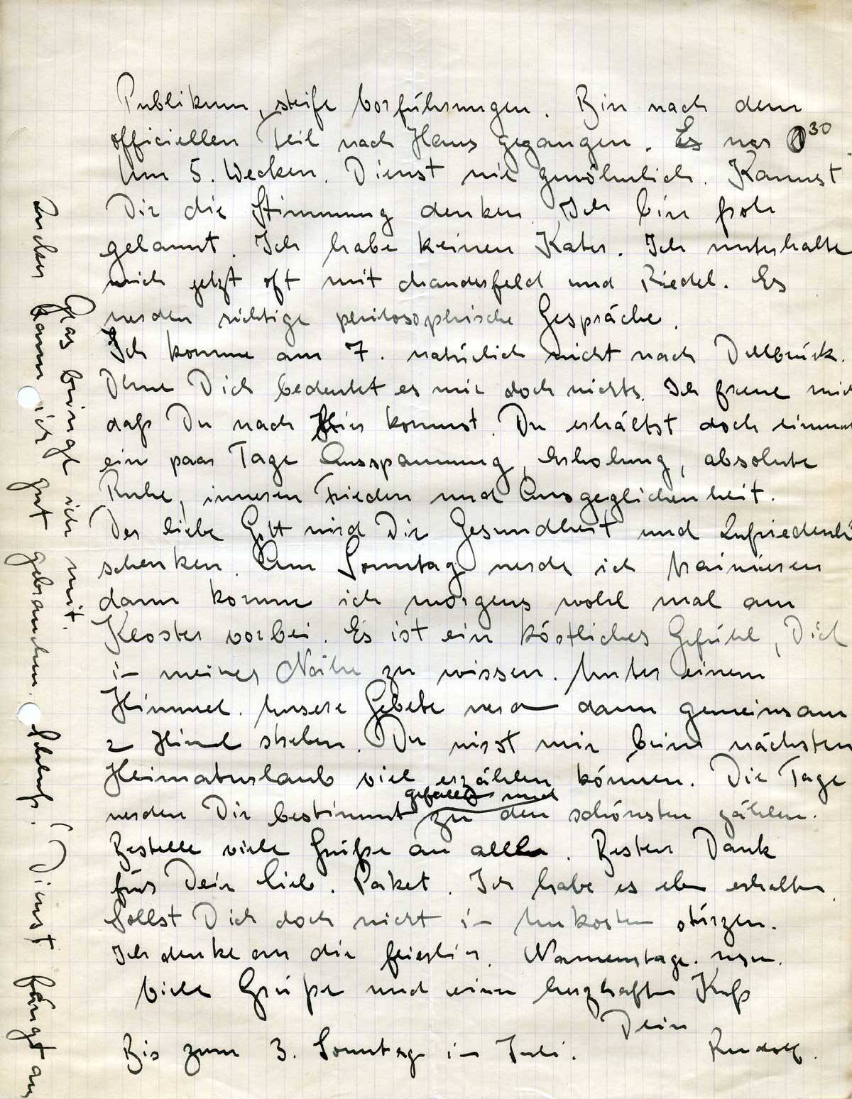 Ich komme am 7. natürlich nicht nach Dellbrück. Ohne Dich bedeutet es mir doch nichts. Ich freue mich, daß Du nach hier kommst. Du erhältst doch einmal ein paar Tage Ausspannung, Erholung, absolute Ruhe, inneren Frieden und Ausgeglichenheit.