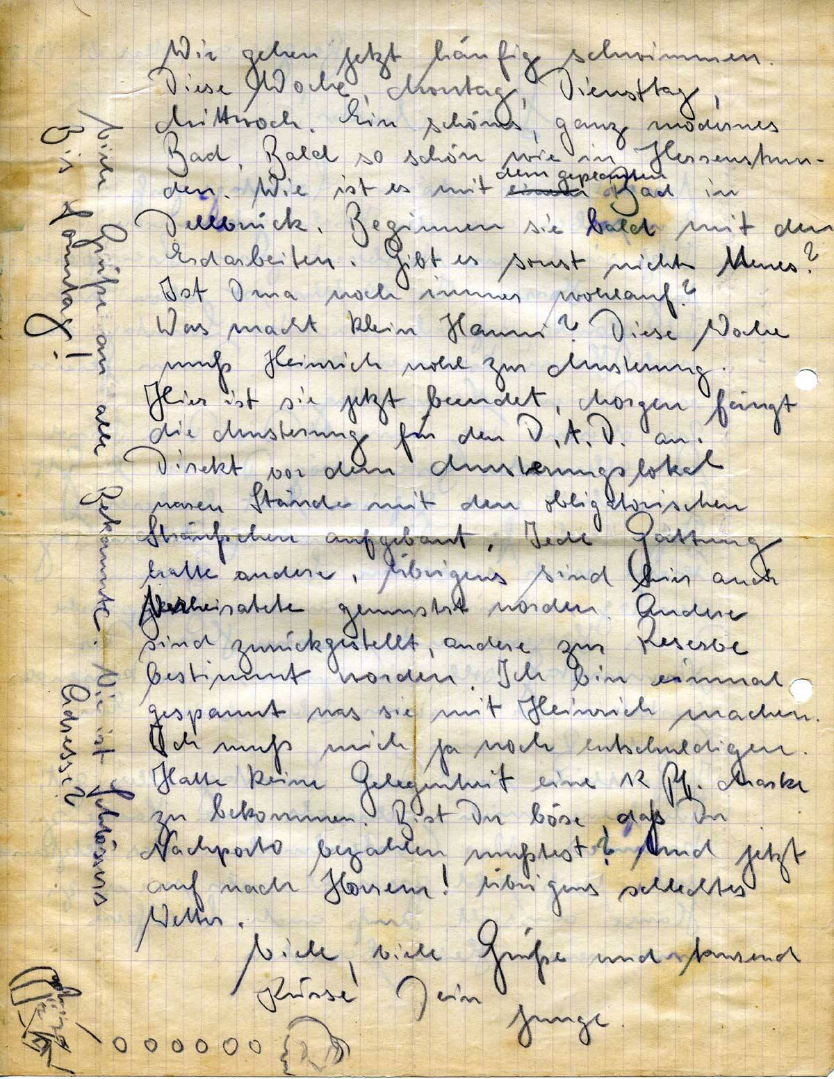 Wir gehen jetzt häufig schwimmen. Diese Woche, Montag, Dienstag, Mittwoch. Ein schönes, ganz modernes Bad. Bald so schön wie in Herrenstrunden. Wie ist es mit dem geplanten Bad in Dellbrück. Beginnen sie bald mit den Erdarbeiten. Gibt es sonst nichts Neues? Ist Oma noch immer wohlauf? Was macht klein Hanni? Diese Woche muß Heinrich wohl zur Musterung.