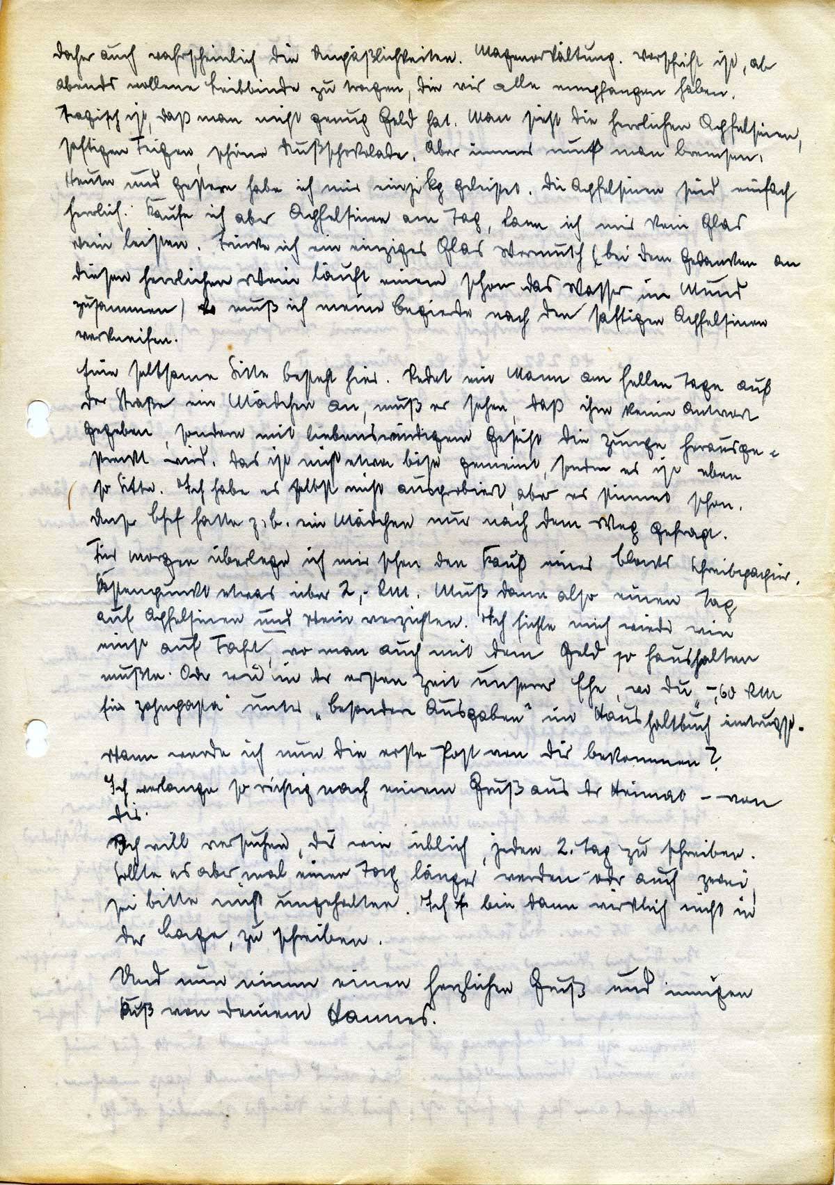 Für morgen überlege ich mir schon den Kauf eines Blocks Schreibpapier. Kostenpunkt etwas über 2,- RM. Muß dann also einen Tag auf Apfelsinen und Wein verzichten. Ich fühle mich wieder wie einst auf Fahrt, wo man auch mit dem Geld so haushalten mußte. Oder wie in der ersten Zeit unserer Ehe, wo Du „–,60 RM für Zahnpasta“ unter „besondere Ausgaben“ im Haushaltbuch eintrugst.