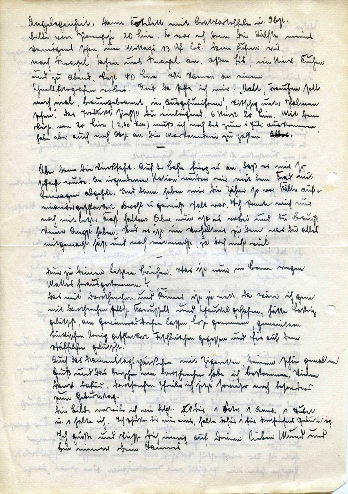 Meine Briefe, Du entschuldigst, können tatsächlich nicht mehr so regelmäßig sein. Heute geht es mir wieder ausgezeichnet. Am Freitag hatte ich einen bösen Abend und gestern, nach einem wunderbar verbrachten Sonntag, bekam ich des Abends, schon auf der Rückreise denselben Anfall. Anscheinend aber keine schlimme Sache, denn heute morgen war es wie weggeblasen. Außer den Durchfalls-Erscheinungen bekomme ich dann ein dumpfes Gefühl in den ganzen Körper. Die „Gebeine sind wie erschlagen“. Schüttelfröste kriechen mir den Rücken rauf und runter, dazu hohes Fieber. Aber heute habe ich einen tadellosen Tag gehabt. Nur 2´ auf dem Lokus, dazu körperlich und geistig frisch. Anbei Zulassungsmarken. Schicke bald etwas. Geld kannst Du keines schicken, da in diesem Land verboten. Aber Kuchen kannst Du einen backen.