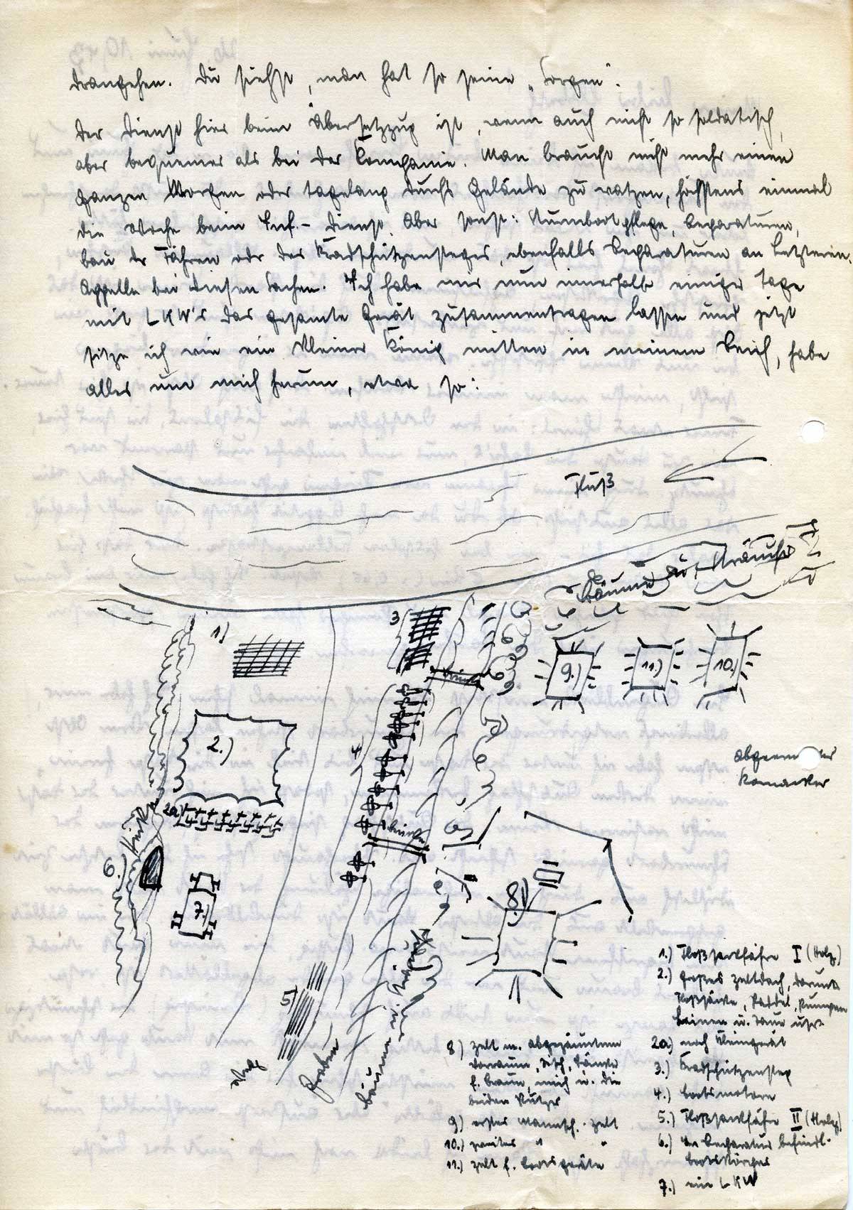 Der Dienst hier beim Übersetzzug ist, wenn auch nicht so soldatisch, aber bequemer als bei der Kompanie. Man braucht nicht mehr einen ganzen Morgen oder tagelang durchs Gelände zu watzen, höchstens einmal die Woche beim Inf.-Dienst. Aber sonst: Sturmbootpflege, Reparaturen, Bau der Fähren oder des Kradschützensteges, ebenfalls Reparaturen an Letzteren, Appelle bei diesen Sachen. Ich habe mir nun innerhalb einiger Tage mit LKW’s das gesamte Gerät zusammentragen lassen und jetzt sitze ich wie ein kleiner König mitten in meinem Reich, habe alles um mich herum, etwa so: