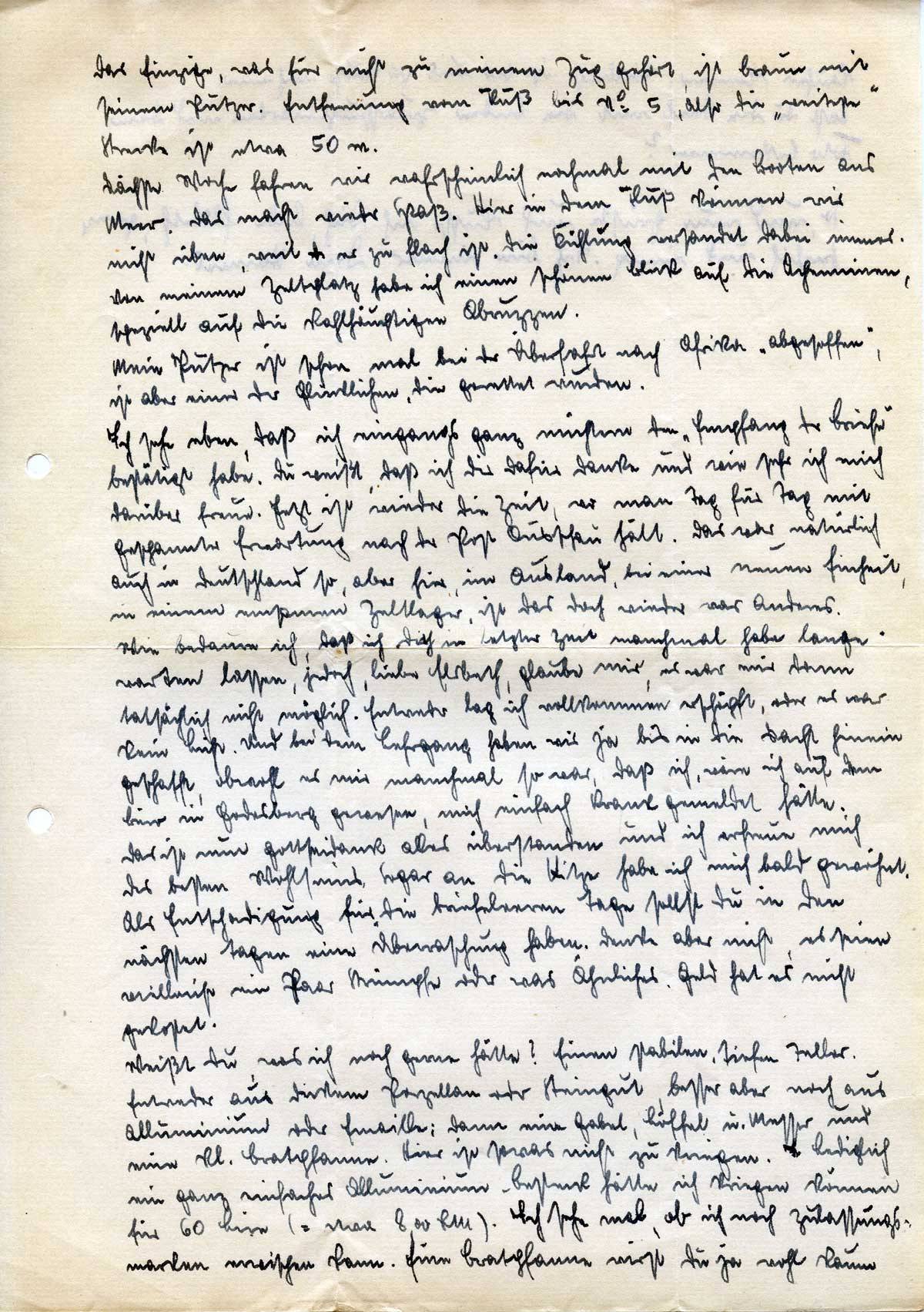Weißt Du, was ich noch gerne hätte? Einen stabilen, tiefen Teller. Entweder aus dickem Porzellan oder Steingut, besser aber noch aus Alluminium oder Emaille; dann eine Gabel, Löffel u. Messer und eine kl. Bratpfanne. Hier ist sowas nicht zu kriegen. Lediglich ein ganz einfaches Aluminium-Besteck hätte ich kriegen können für 60 Lire (= etwa 8,00 RM). Ich sehe mal, ob ich noch Zulassungsmarken erwischen kann. Eine Bratpfanne wirst Du ja wohl kaum