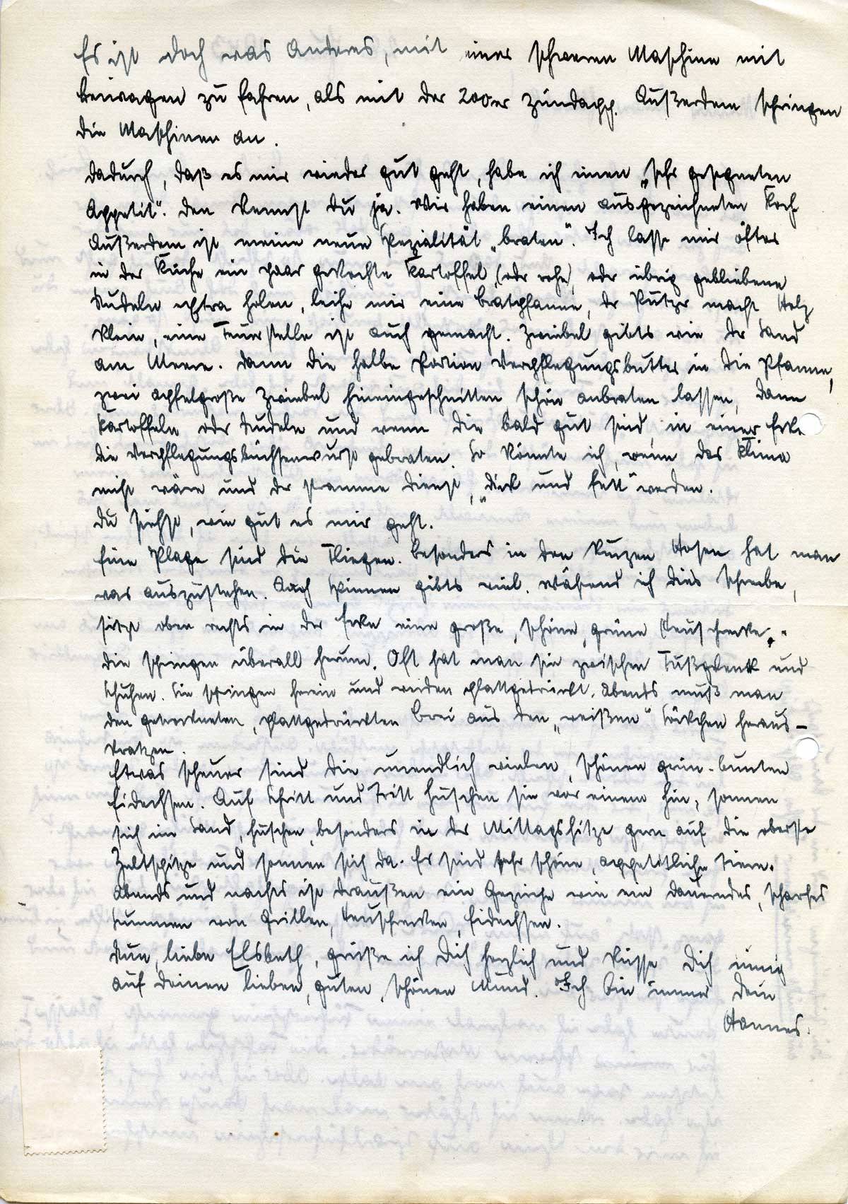 Dadurch, daß es mir wieder gut geht, habe ich einen „sehr gesegneten Appetit“. Den kennst Du ja. Wir haben einen ausgezeichneten Koch. Außerdem ist meine neue Spezialität „braten“.