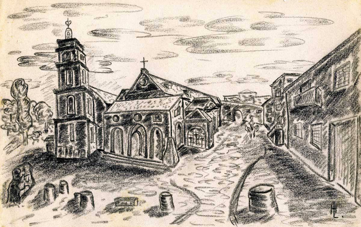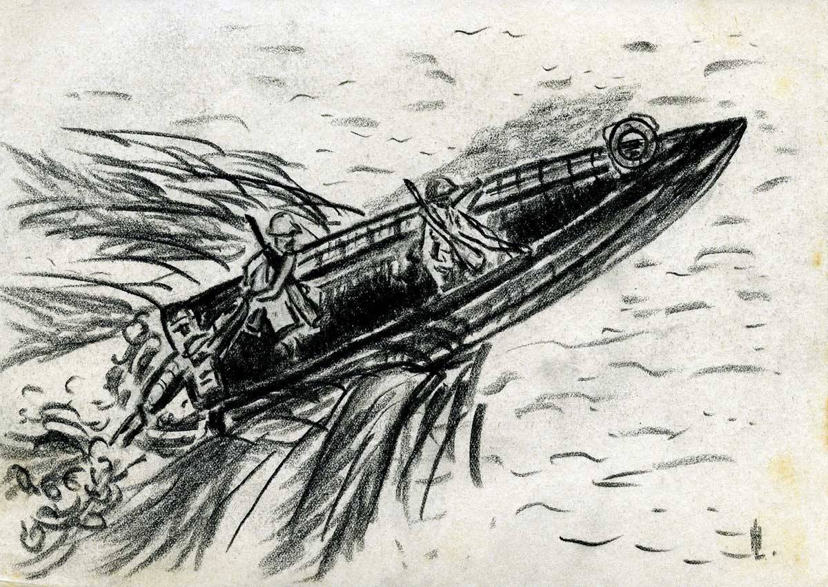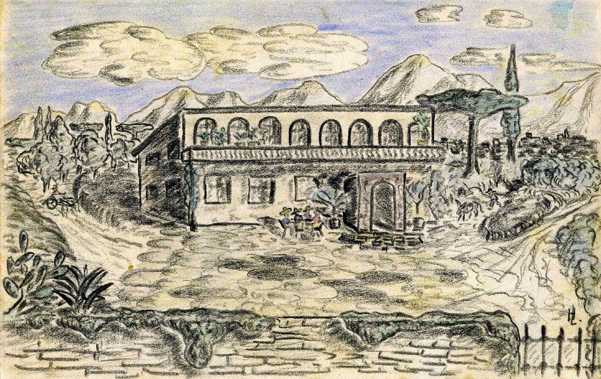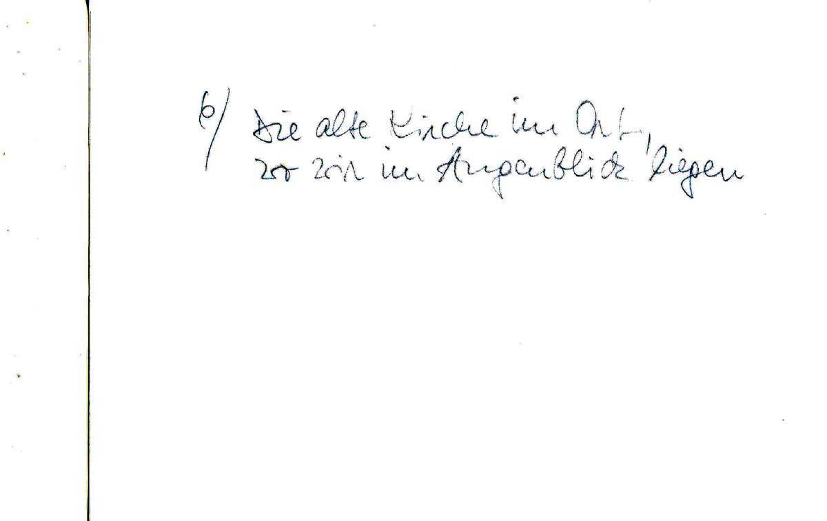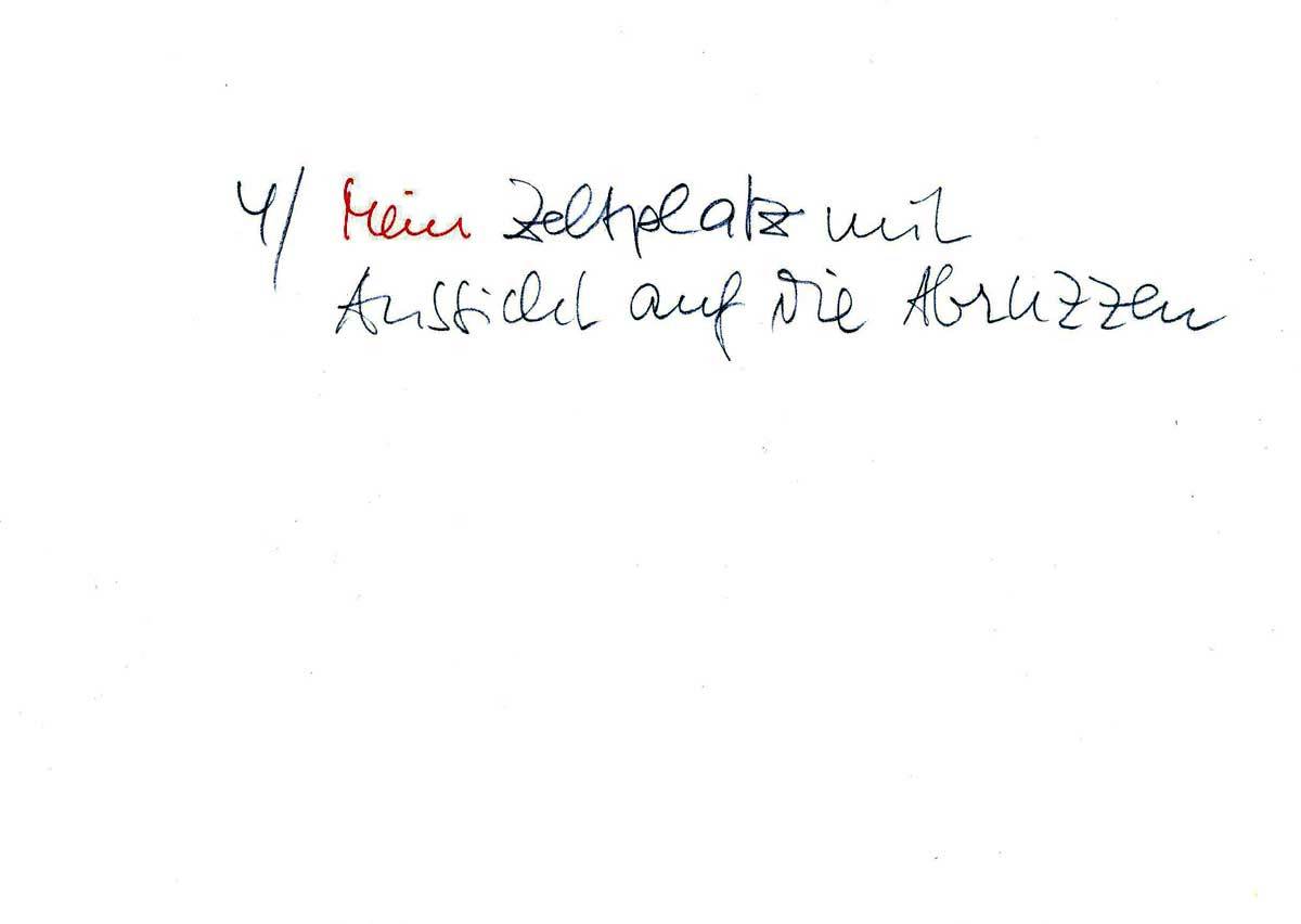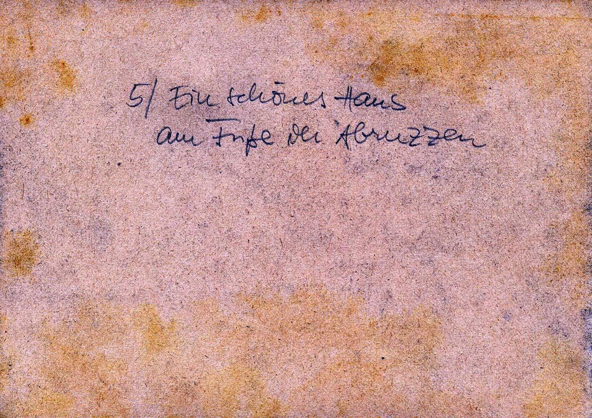 Zuerst recht herzlichen Dank für Deinen lieben, langen Brief. Das mit Anna ist ja dumm. Erst mal wegen Anna, dann aber auch hat nun Vater alles alleine am Hals. Wäre das nur mit der Backerei [Hannes’ Vater besitzt eine Bäckerei] geregelt. Und daß es Dir nun so schlecht dadurch geht und daß Dorotheechen krank feiert, beunruhigt mich doch. Auch, wenn Du das alles so harmlos darstellst, beruhigt mich nicht so ganz. Mir geht es fortlaufend gut. In meinen freien Abendstunden habe ich mir eine Freude für Dich ausgedacht. Ich habe „gemalt“ und gezeichnet. „Ausstellungsreif“ sind die Sachen natürlich nicht. Aber ich habe mich bemüht, Dir einen Eindruck über Verschiedenes hier in Italien zu vermitteln. Es ist darin ein Querstreifen über mein Leben und meine Umwelt enthalten. Da ist erstens mal das alte Fischerörtchen, ein ehemaliges Kastell, von dem ich Dir schon schrieb, zweitens ein alter, romanischer Hauseingang in demselben Städtchen. Drittens ein Sturmboot, mein jetziges Leben, in Fahrt. Viertens mein Zeltplatz mit Aussicht auf die Abruzzen. Fünftens ein schönes Haus am Fuße der Abruzzen, sechstens die alte Kirche im Ort, wo wir im Augenblick liegen.