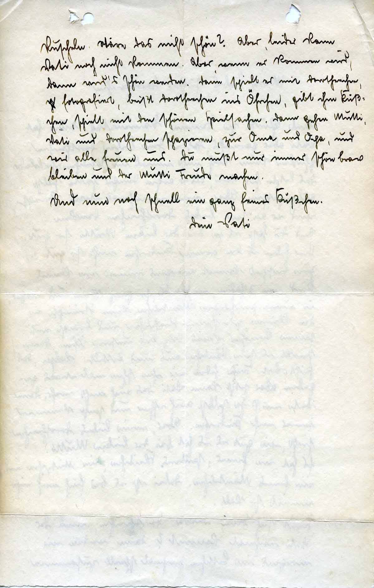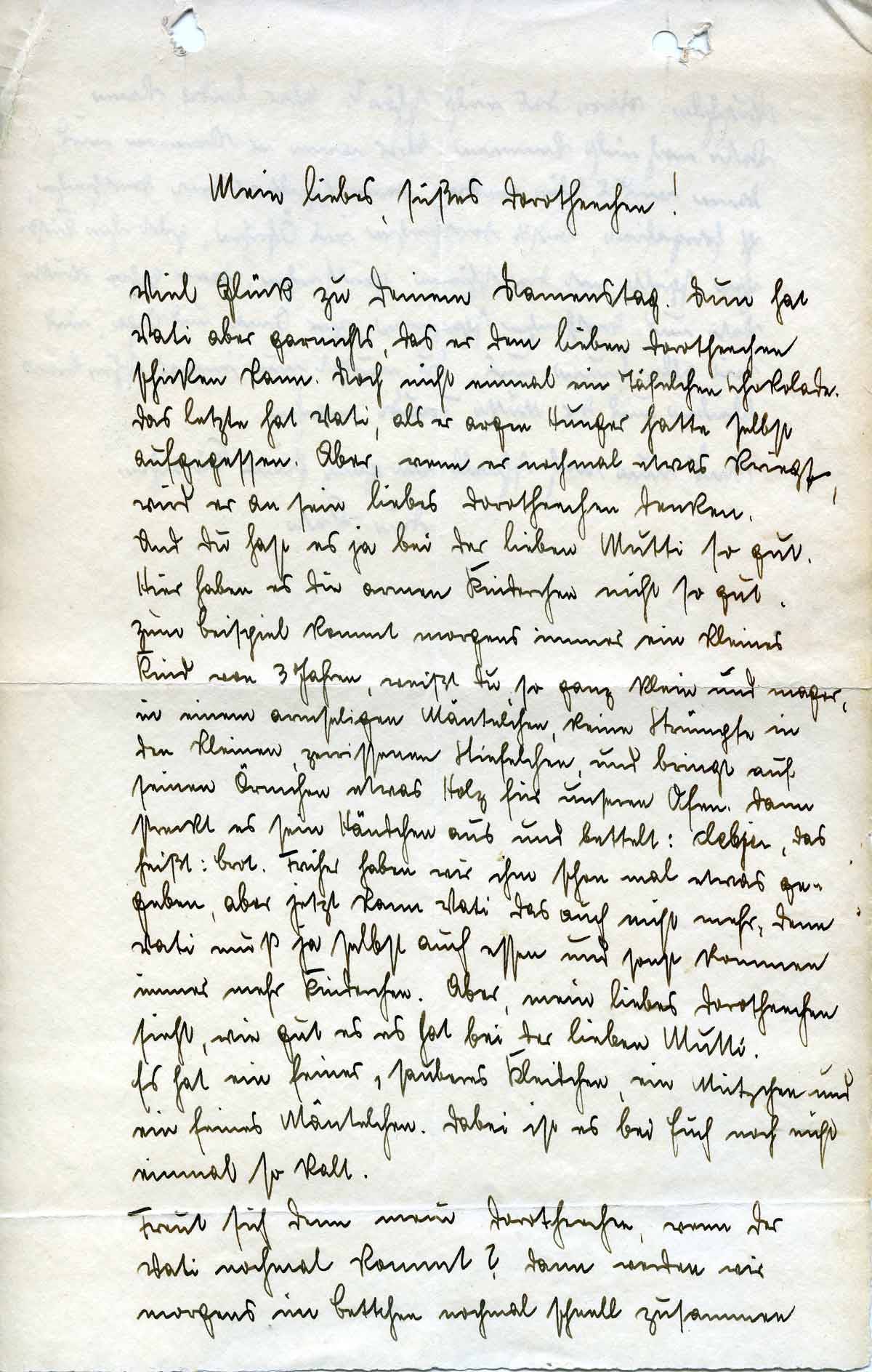 Viel Glück zu Deinem Namenstag. Nun hat Vati aber gar nichts, das er dem lieben Dorotheechen schicken kann. Noch nicht einmal ein Täfelchen Schokolade. Das letzte hat Vati, als er argen Hunger hatte selbst aufgegessen. Aber, wenn er nochmal etwas kriegt, wird er an sein liebes Dorotheechen denken. Und Du hast es ja bei der lieben Mutti so gut. Hier haben es die armen Kinderchen nicht so gut. Zum Beispiel kommt morgens immer ein kleines Kind von 3 Jahren, weißt Du so ganz klein und mager, in einem armseligen Mäntelchen, keine Strümpfe in den kleinen, zerrissenen Stiefelchen, und bringt auf seinen Ärmchen etwas Holz für unseren Ofen. Dann streckt es sein Händchen aus und bettelt: clebjer [?], das heißt: Brot.